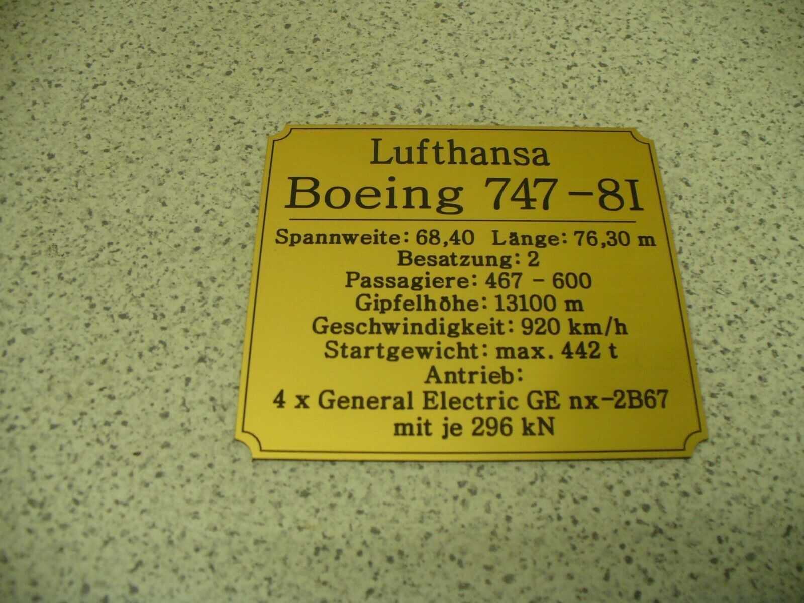 Sie bieten hier auf: 1 Namensschild - Boeing 747 8I - mit verschiedenen Daten (siehe Bild) goldfarbig mit schwarzem Schriftzug (auch in weiss - oder silberfarbig möglich --> dann bitte angeben) Abmessung: 94 x 87 x 1,5 mm Das Schild ist von mir mit einer CNC-Fräse aus 1,5mm dickem, 2-farbigem Gra