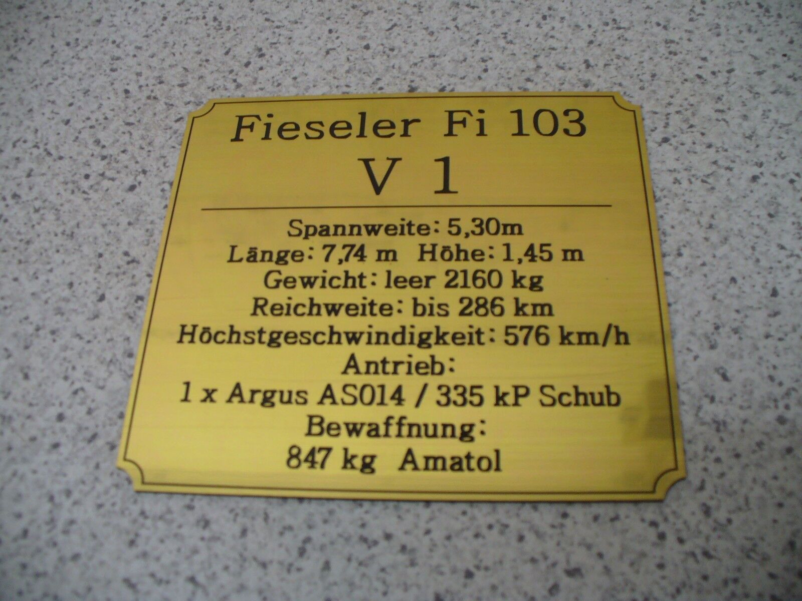 Sie bieten hier auf: 1 Namensschild - Fieseler F 103 - V1 - mit verschiedenen Daten (siehe Bild) goldfarbig mit schwarzem Schriftzug (auch in weiss - oder silberfarbig möglich --> dann bitte angeben) Abmessung: 94 x 87 x 1,5 mm Das Schild ist von mir mit einer CNC-Fräse aus 1,5mm dickem, 2-farbig