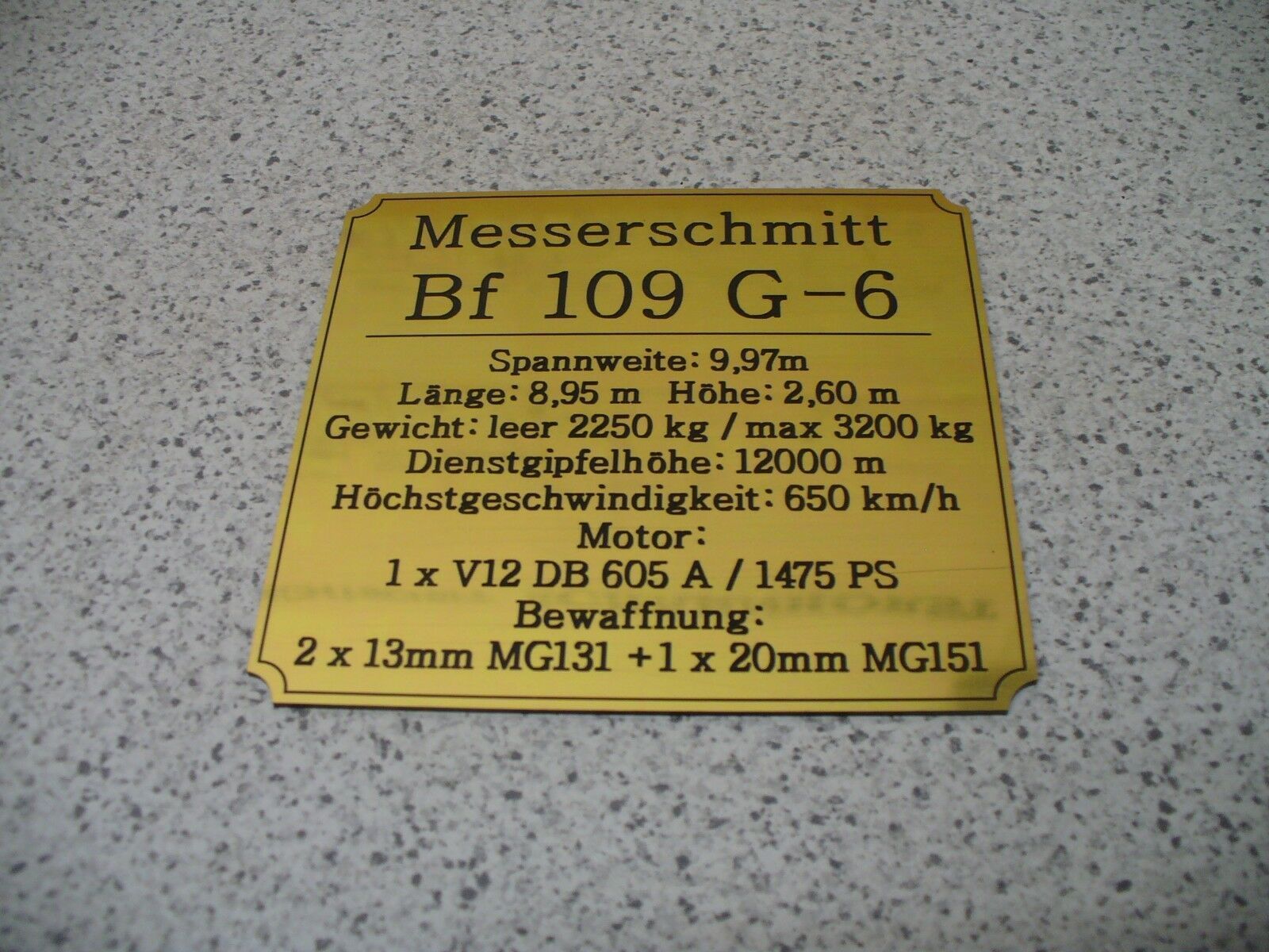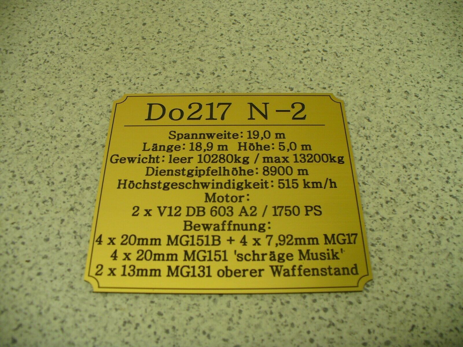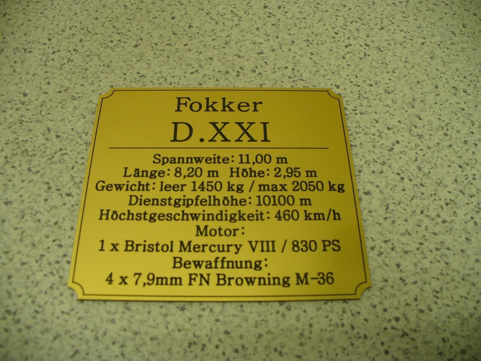 Sie bieten hier auf: 1 Namensschild - Fokker D.XXI - mit verschiedenen Daten (siehe Bild) goldfarbig mit schwarzem Schriftzug (auch in weiss - oder silberfarbig möglich --> dann bitte angeben) Abmessung: 94 x 87 x 1,5 mm Das Schild ist von mir mit einer CNC-Fräse aus 1,5mm dickem, 2-farbigem Grav