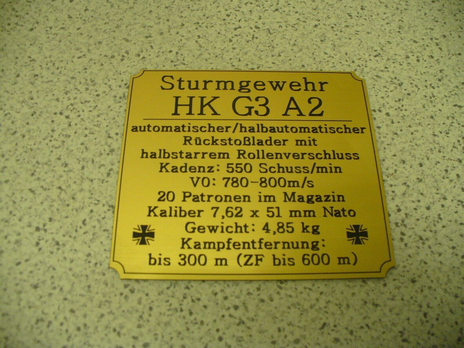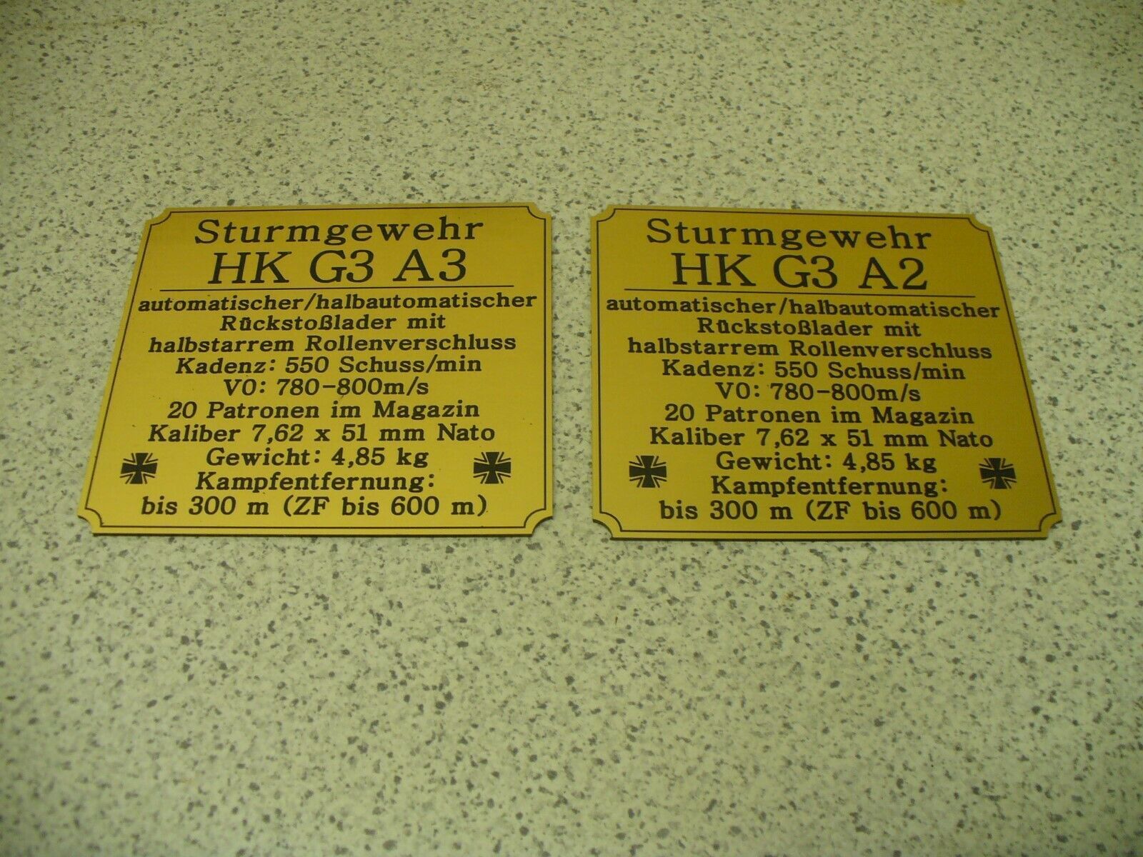Sie bieten hier auf: 1 Namensschild - Gewehr G3A3 - mit verschiedenen Daten (siehe Bild) auf Wunsch auch als - HK G3 A2 - oder - HK G3 A3 - (dann bitte angeben) goldfarbig mit schwarzem Schriftzug (auch in weiss - oder silberfarbig möglich --> dann bitte angeben) Abmessung: 94 x 87 x 1,5 mm Das S