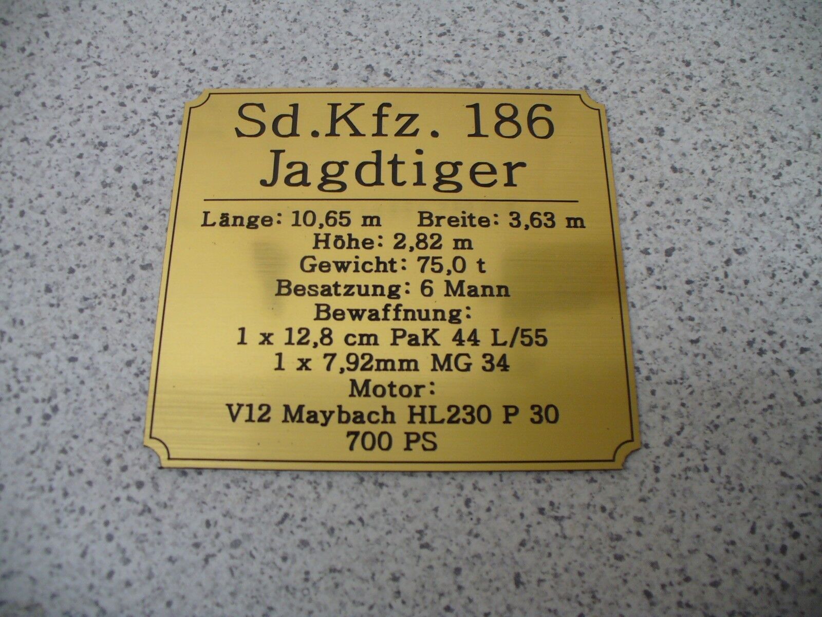 Sie bieten hier auf: 1 Namensschild - Jagdtiger - mit verschiedenen Daten (siehe Bild) goldfarbig mit schwarzem Schriftzug (auch in weiss - oder silberfarbig möglich --> dann bitte angeben) Abmessung: 94 x 87 x 1,5 mm Das Schild ist von mir mit einer CNC-Fräse aus 1,5mm dickem, 2-farbigem Gravier
