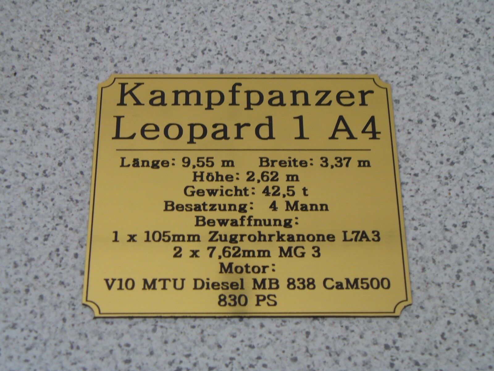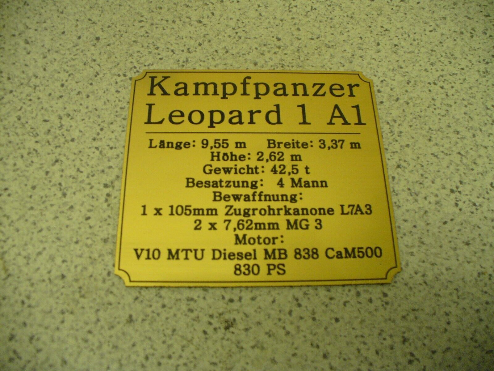 Sie bieten hier auf: 1 Namensschild - Leopard 1 A4 - (oder - Leopard 1 A1 - (dann bitte angeben) ) mit verschiedenen Daten (siehe Bild) goldfarbig mit schwarzem Schriftzug (auch in weiss - oder silberfarbig möglich --> dann bitte angeben) Abmessung: 94 x 87 x 1,5 mm Das Schild ist von mir mit ein