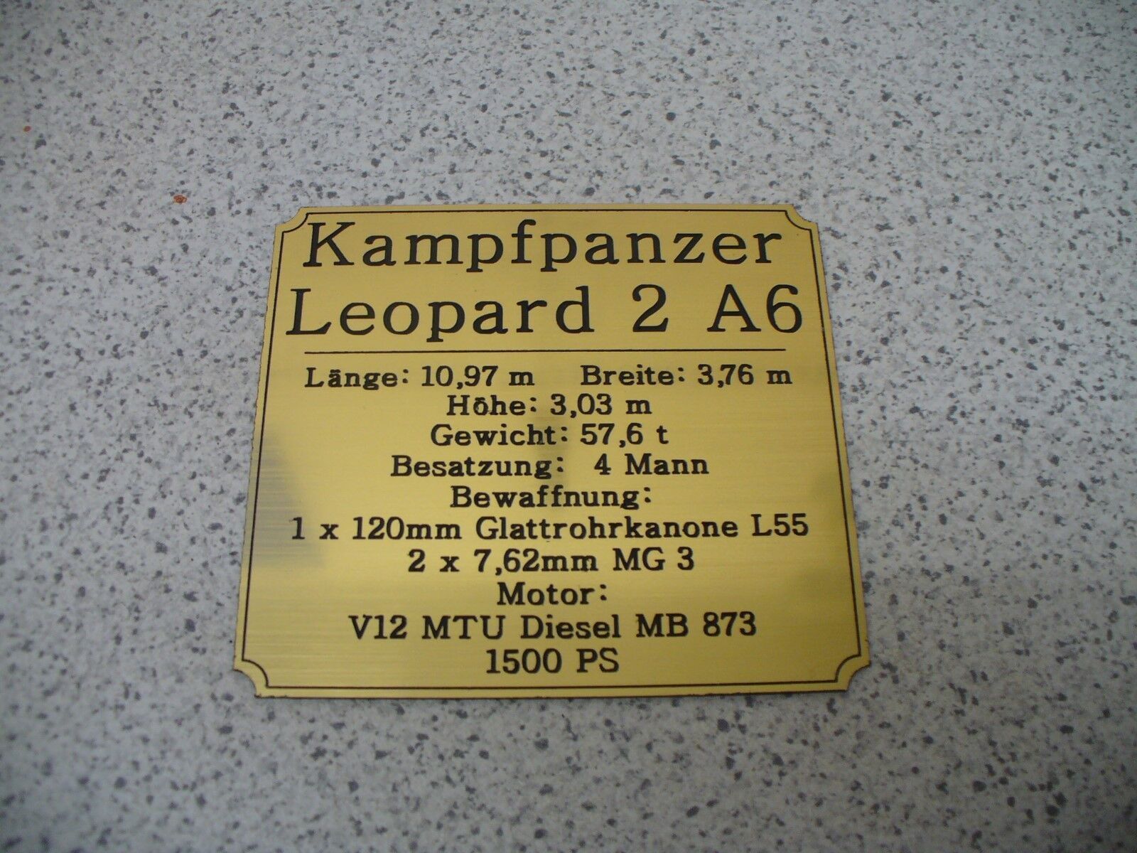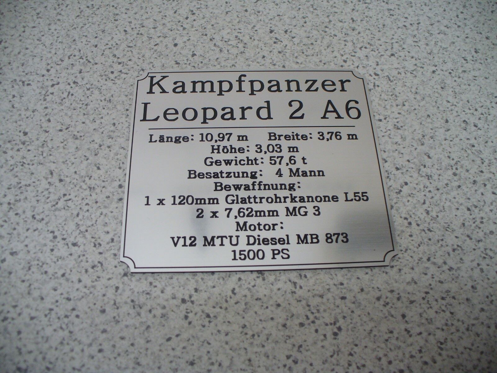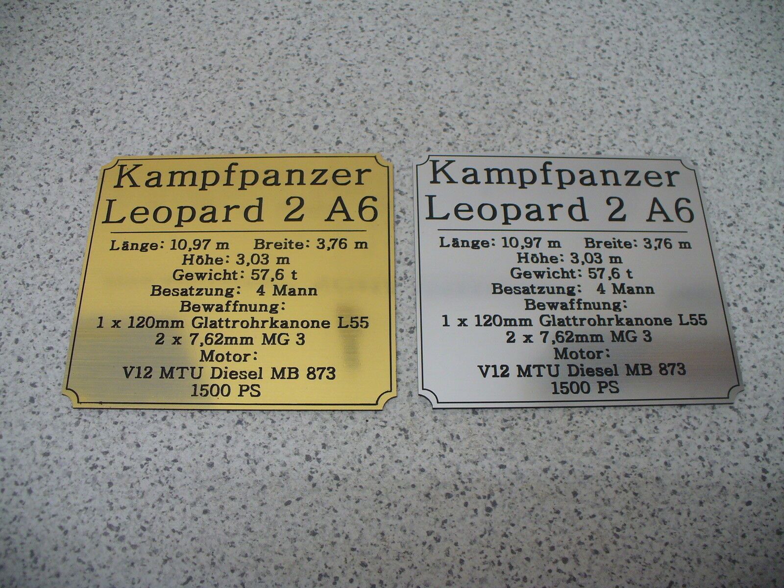 Sie bieten hier auf: 1 Namensschild - Leopard 2 A6 - mit verschiedenen Daten (siehe Bild) goldfarbig mit schwarzem Schriftzug (auch in weiss - oder silberfarbig möglich --> dann bitte angeben) Abmessung: 94 x 87 x 1,5 mm Das Schild ist von mir mit einer CNC-Fräse aus 1,5mm dickem, 2-farbigem Grav