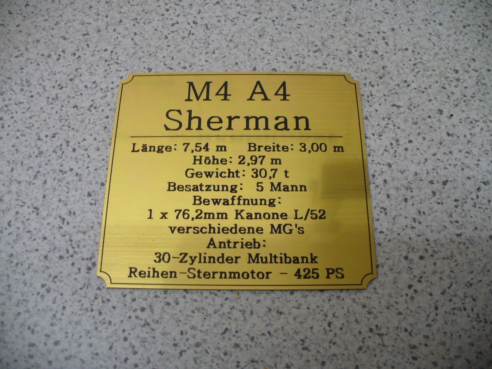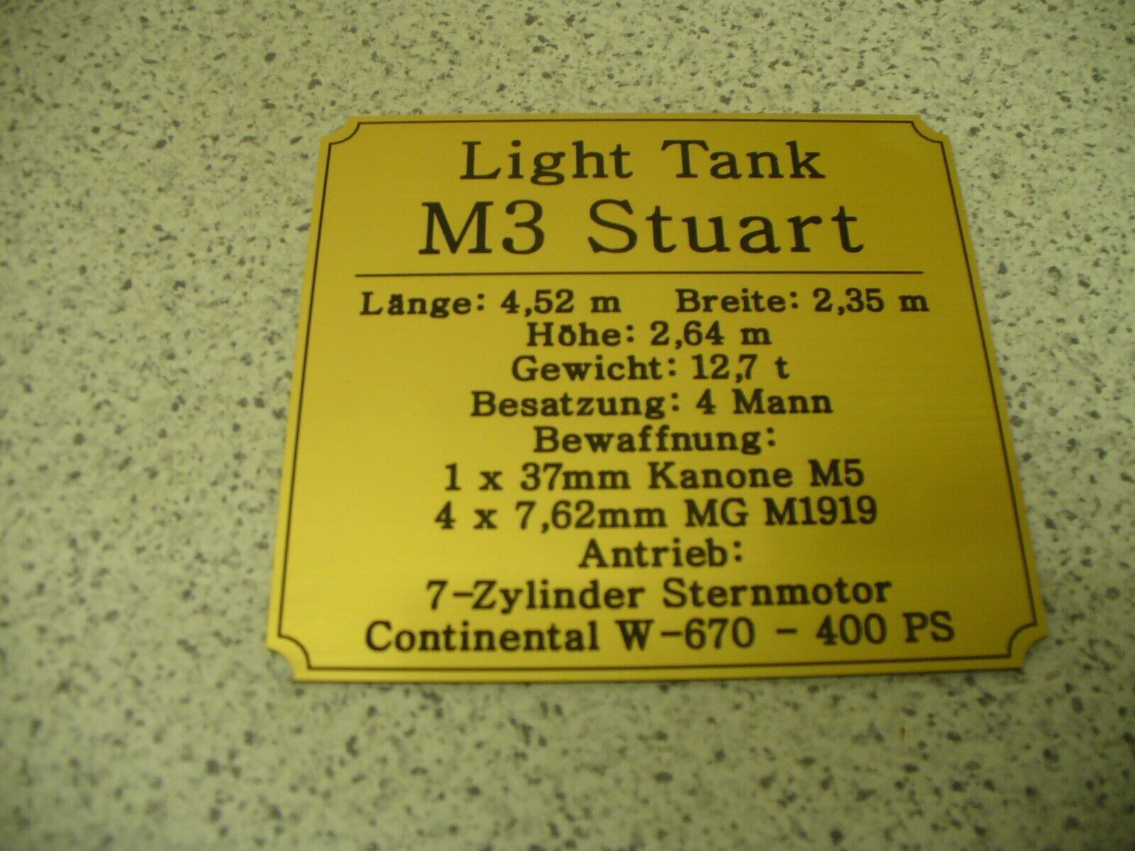 Sie bieten hier auf: 1 Namensschild - M3 Stuart - mit verschiedenen Daten (siehe Bild) goldfarbig mit schwarzem Schriftzug (auch in weiss - oder silberfarbig möglich --> dann bitte angeben) Abmessung: 94 x 87 x 1,5 mm Das Schild ist von mir mit einer CNC-Fräse aus 1,5mm dickem, 2-farbigem Gravier