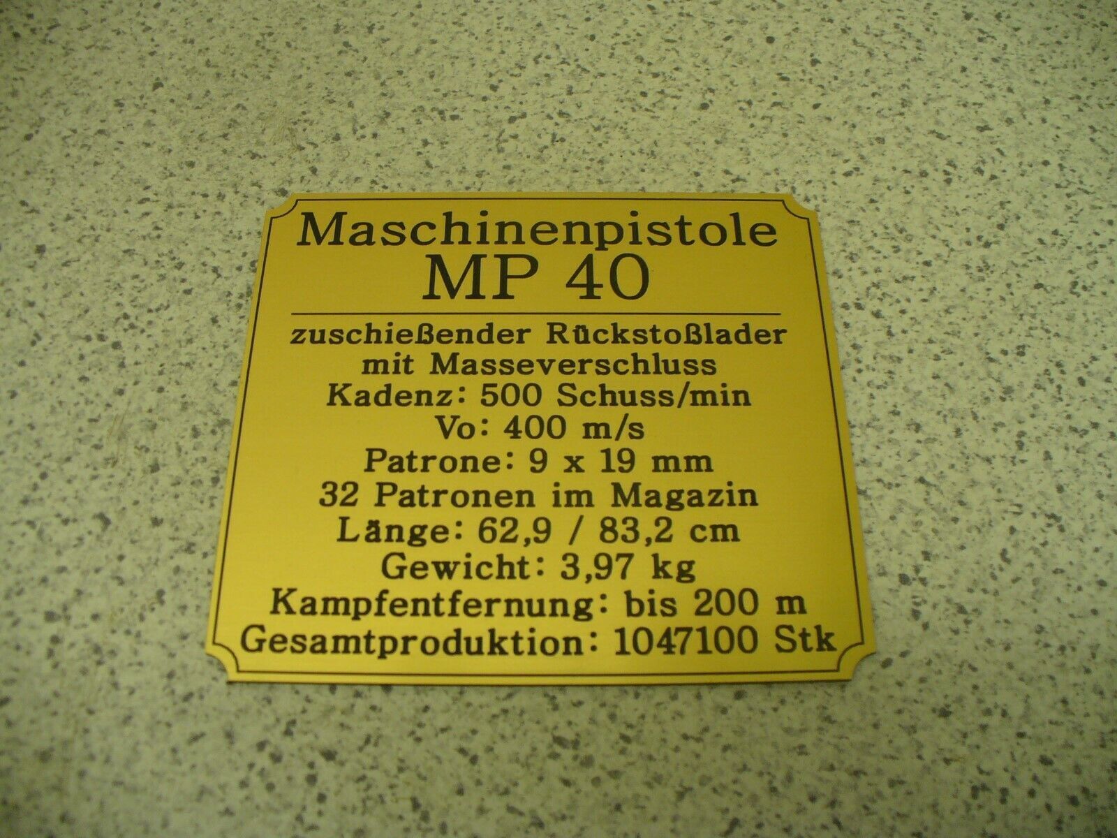 Sie bieten hier auf: 1 Namensschild - Maschinenpistole MP40 - mit verschiedenen Daten (siehe Bild) goldfarbig mit schwarzem Schriftzug (auch in weiss - oder silberfarbig möglich --> dann bitte angeben) Abmessung: 94 x 87 x 1,5 mm Das Schild ist von mir mit einer CNC-Fräse aus 1,5mm dickem, 2-farb