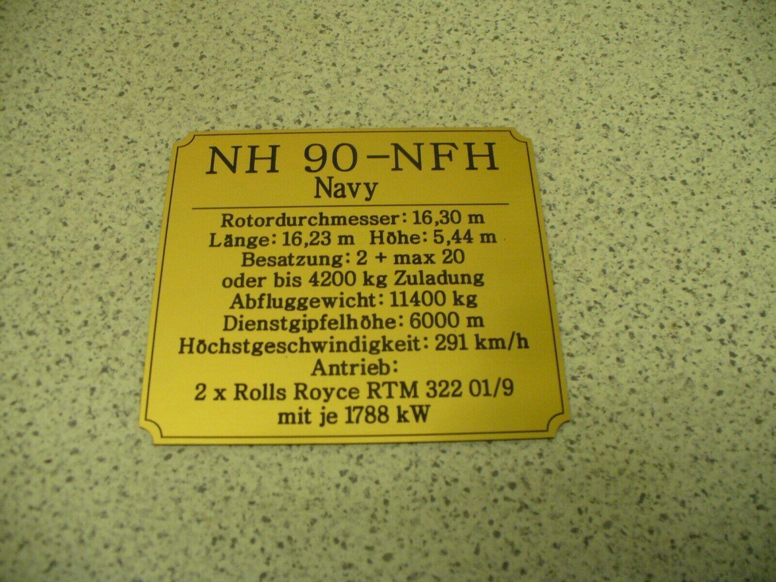 Sie bieten hier auf: 1 Namensschild - NH 90-NFH Navy - (oder NH 90-TTH Heer - dann bitte angeben ) mit verschiedenen Daten (siehe Bild) goldfarbig mit schwarzem Schriftzug (auch in weiss - oder silberfarbig möglich --> dann bitte angeben) Abmessung: 94 x 87 x 1,5 mm Das Schild ist von mir mit ein