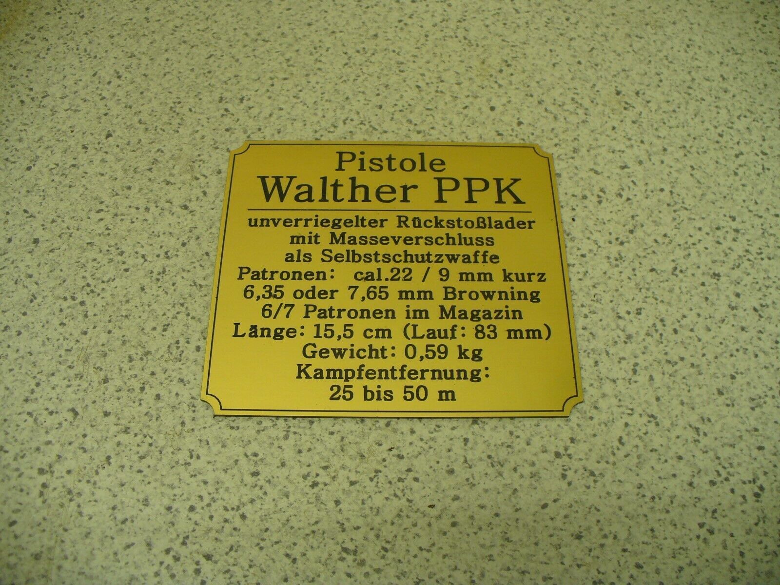 Sie bieten hier auf: 1 Namensschild - Pistole Walther PPK - mit verschiedenen Daten (siehe Bild) goldfarbig mit schwarzem Schriftzug (auch in weiss - oder silberfarbig möglich --> dann bitte angeben) Abmessung: 94 x 87 x 1,5 mm Das Schild ist von mir mit einer CNC-Fräse aus 1,5mm dickem, 2-farbig