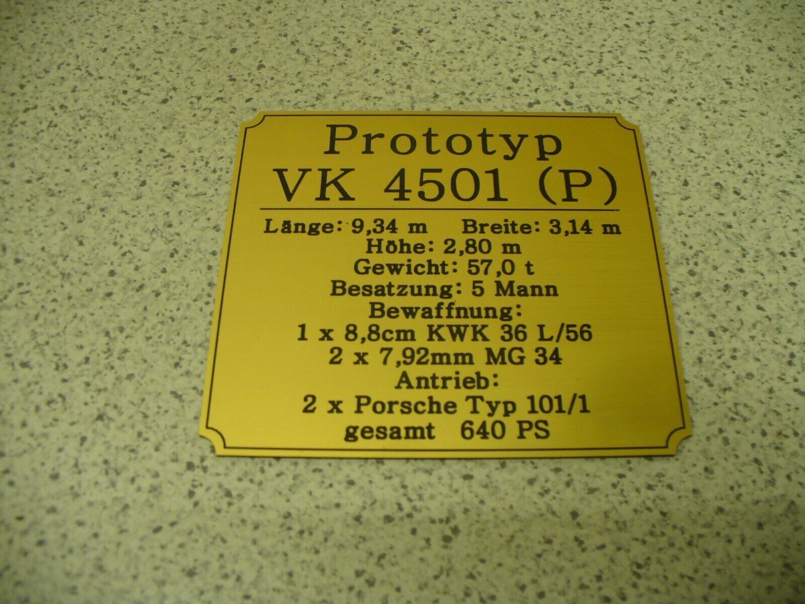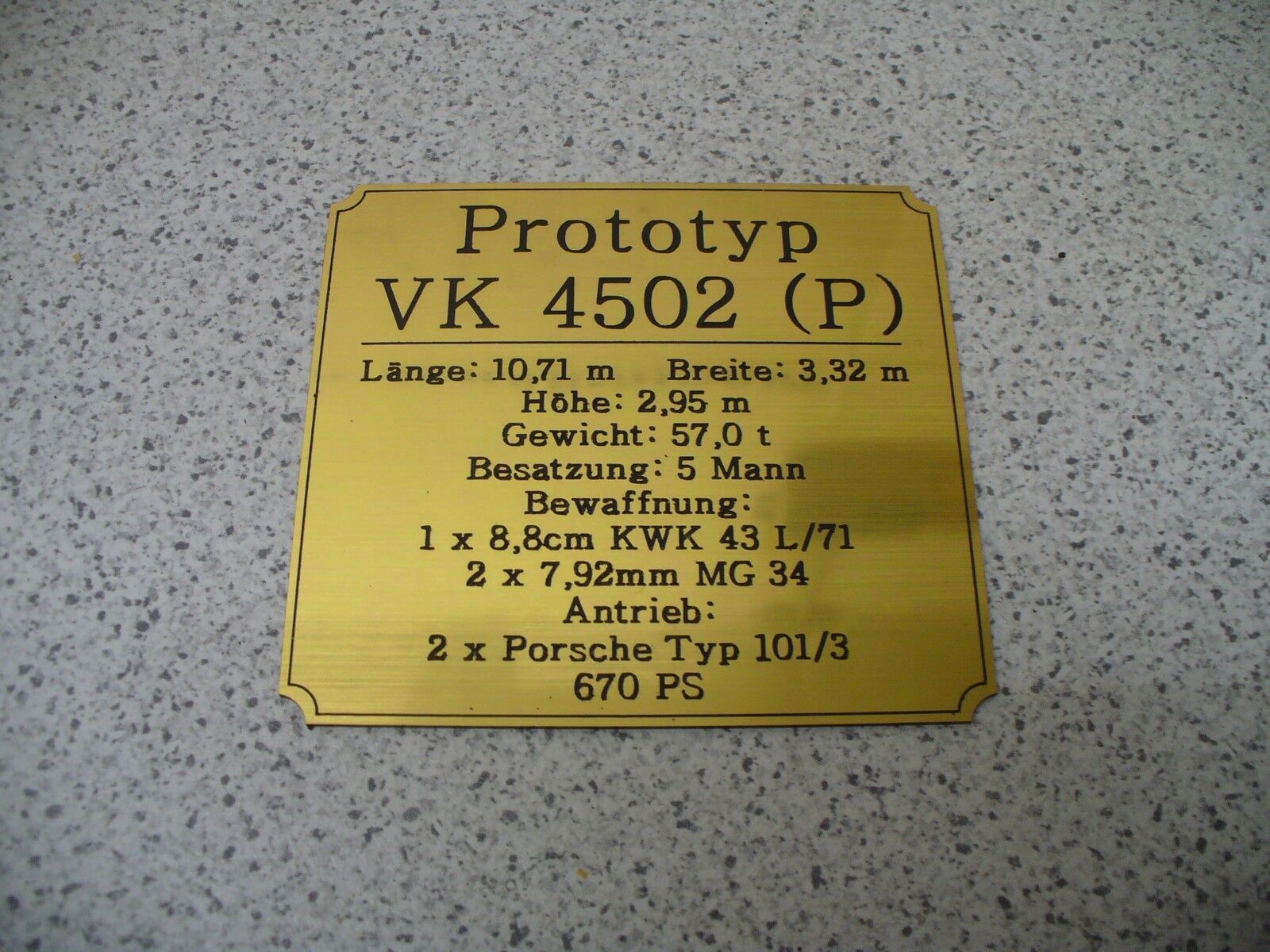 Sie bieten hier auf: 1 Namensschild - Prototyp VK 4502 (P) - (oder VK 4501 (P) - dann bitte angeben) mit verschiedenen Daten (siehe Bild) goldfarbig mit schwarzem Schriftzug (auch in weiss - oder silberfarbig möglich --> dann bitte angeben) Abmessung: 94 x 87 x 1,5 mm Das Schild ist von mir mit e