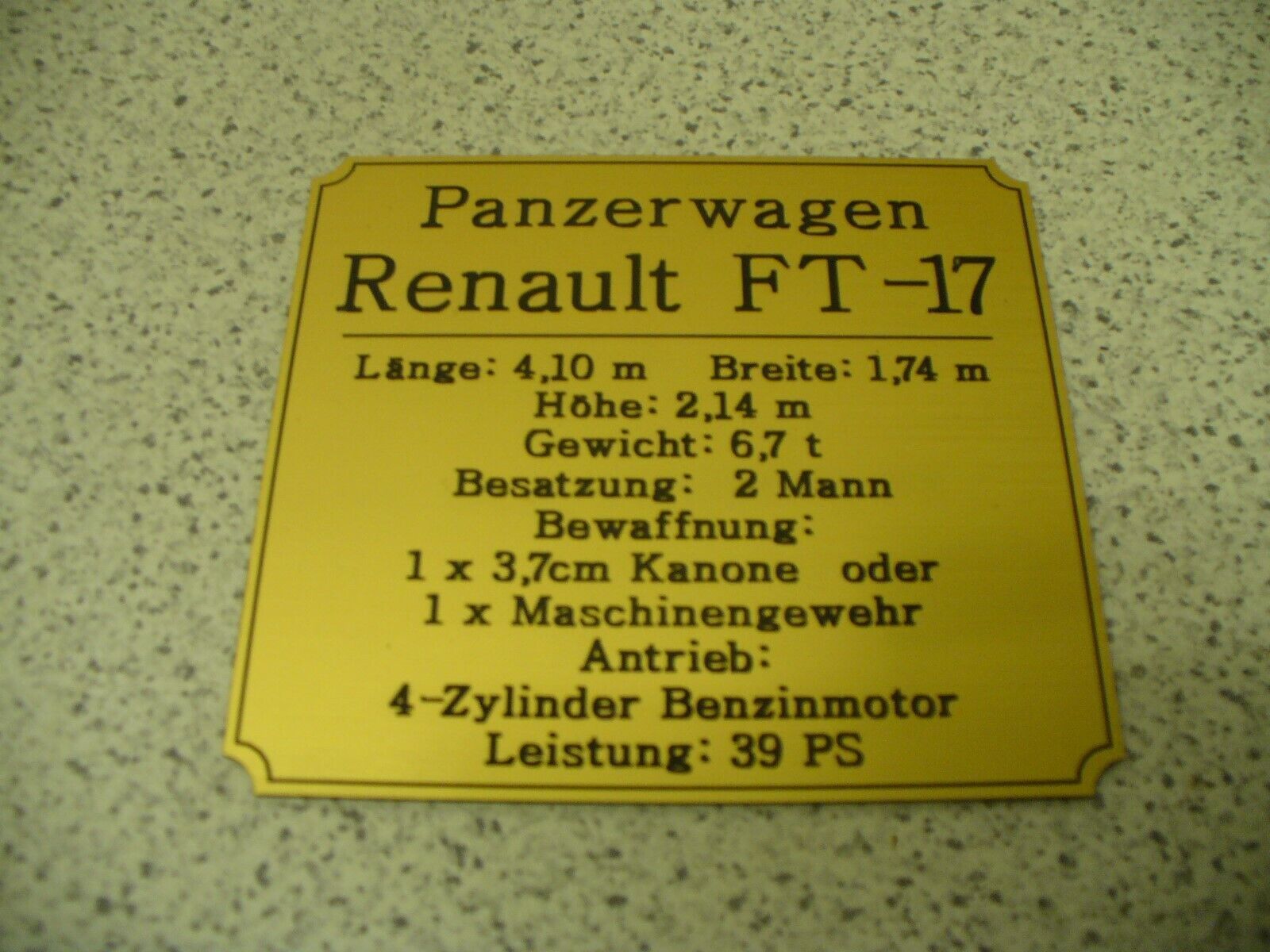 Sie bieten hier auf: 1 Namensschild - Renault FT-17 - mit verschiedenen Daten (siehe Bild) goldfarbig mit schwarzem Schriftzug (auch in weiss - oder silberfarbig möglich --> dann bitte angeben) Abmessung: 94 x 87 x 1,5 mm Das Schild ist von mir mit einer CNC-Fräse aus 1,5mm dickem, 2-farbigem Gra
