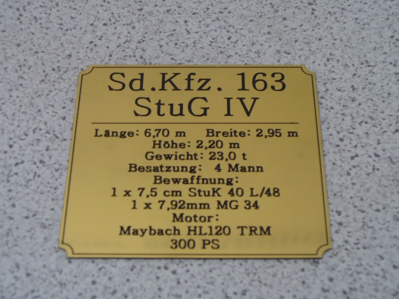 Sie bieten hier auf: 1 Namensschild - StuG IV - mit verschiedenen Daten (siehe Bild) goldfarbig mit schwarzem Schriftzug (auch in weiss - oder silberfarbig möglich --> dann bitte angeben) Abmessung: 94 x 87 x 1,5 mm Das Schild ist von mir mit einer CNC-Fräse aus 1,5mm dickem, 2-farbigem Gravierku