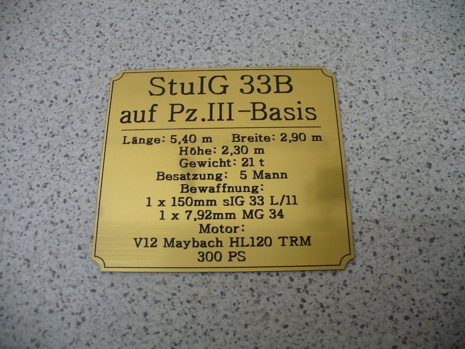 Sie bieten hier auf: 1 Namensschild - StuIG 33B - mit verschiedenen Daten (siehe Bild) goldfarbig mit schwarzem Schriftzug (auch in weiss - oder silberfarbig möglich --> dann bitte angeben) Abmessung: 94 x 87 x 1,5 mm Das Schild ist von mir mit einer CNC-Fräse aus 1,5mm dickem, 2-farbigem Gravier