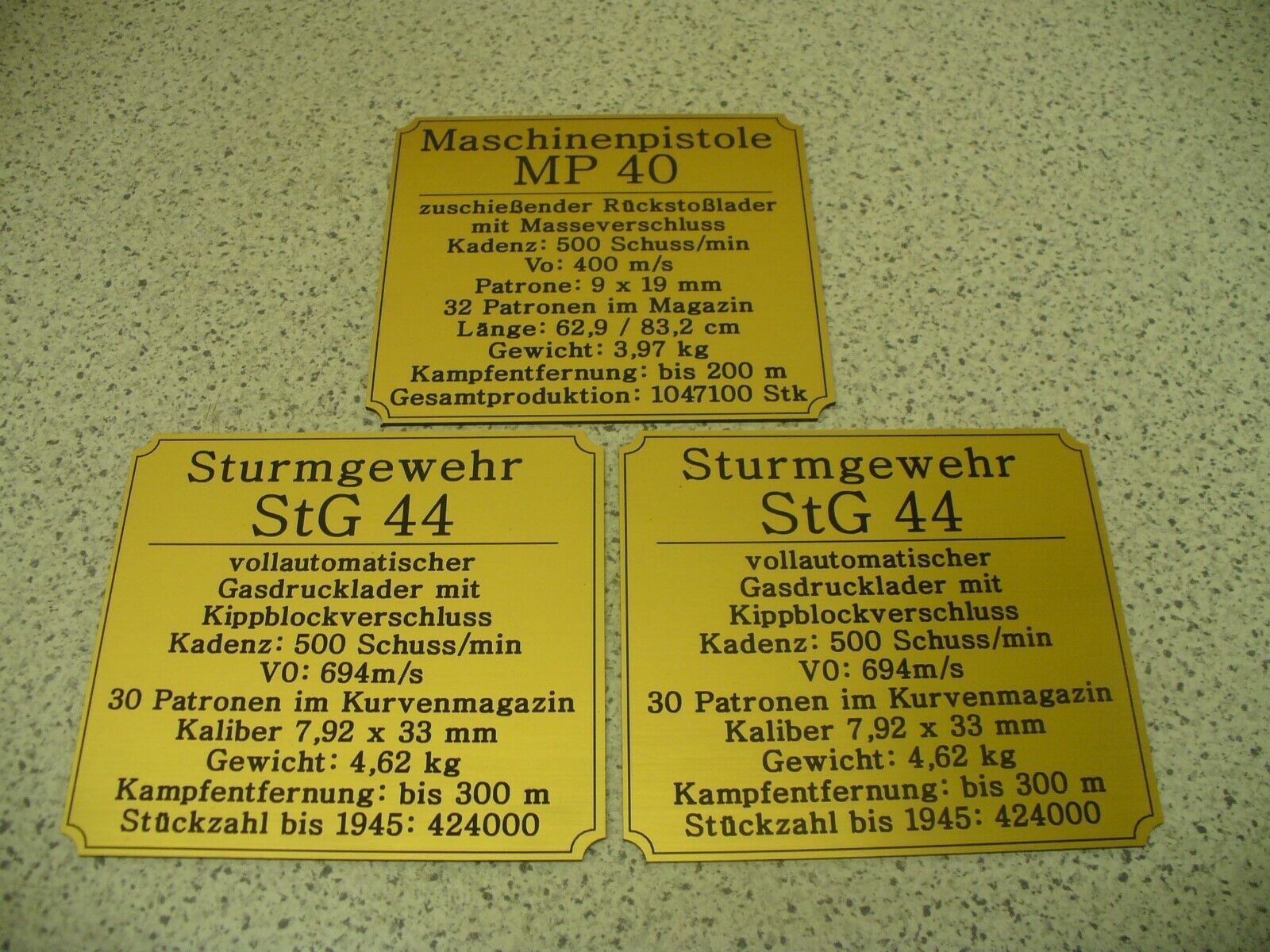 Sie bieten hier auf: 1 Namensschild - Sturmgewehr StG 44 - mit verschiedenen Daten (siehe Bild) goldfarbig mit schwarzem Schriftzug (auch in weiss - oder silberfarbig möglich --> dann bitte angeben) Abmessung: 94 x 87 x 1,5 mm Das Schild ist von mir mit einer CNC-Fräse aus 1,5mm dickem, 2-farbige