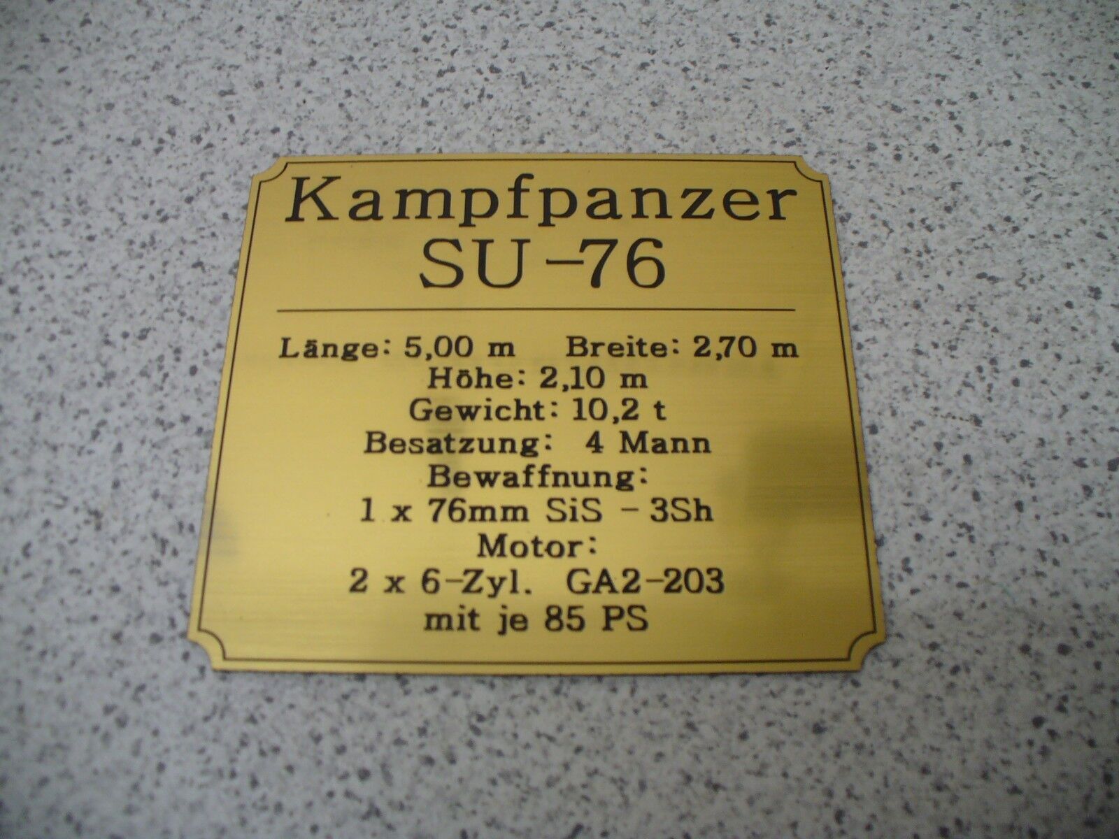 Sie bieten hier auf: 1 Namensschild - SU 76 - mit verschiedenen Daten (siehe Bild) goldfarbig mit schwarzem Schriftzug (auch in weiss - oder silberfarbig möglich --> dann bitte angeben) Abmessung: 94 x 87 x 1,5 mm Das Schild ist von mir mit einer CNC-Fräse aus 1,5mm dickem, 2-farbigem Gravierkuns