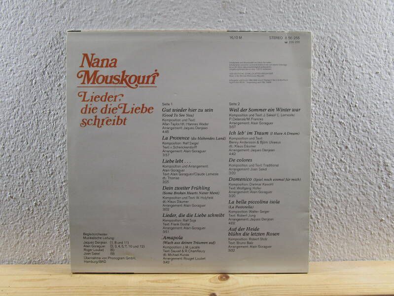 Nana Mouskouri – Lieder, Die Die Liebe Schreibt Amiga 8 56 256 1987 Vinyl: VG+ Cover: VG A1 Gut Wieder Hier Zu Sein (Good To See You) 4:45 A2 La Provence (Du Blühendes Land) 3:57 A3 Liebe Lebt... 3:25 A4 Dein Zweiter Frühling (Some Broken Hearts Never Ment) 3:02 A5 Lieder, Die Die Liebe Schreibt 3:5