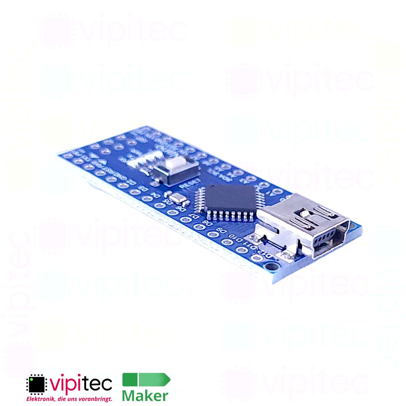 Warenkorb vipitec Shop Aktuelle Angebote Kontakt Komponenten > Entwicklungsplatinen Nano v3.0 Ent& 173;wicklungs& 173;board mit Arduino& 174;-kompatiblem Bootloader , wahlweise mit Mini-USB , Micro-USB oder USB-C Spezifikation: 5 V, 4..16 MHz, CH340, ATmega328PB, 14 Digital-I Os, 8 Analog-Eingäng