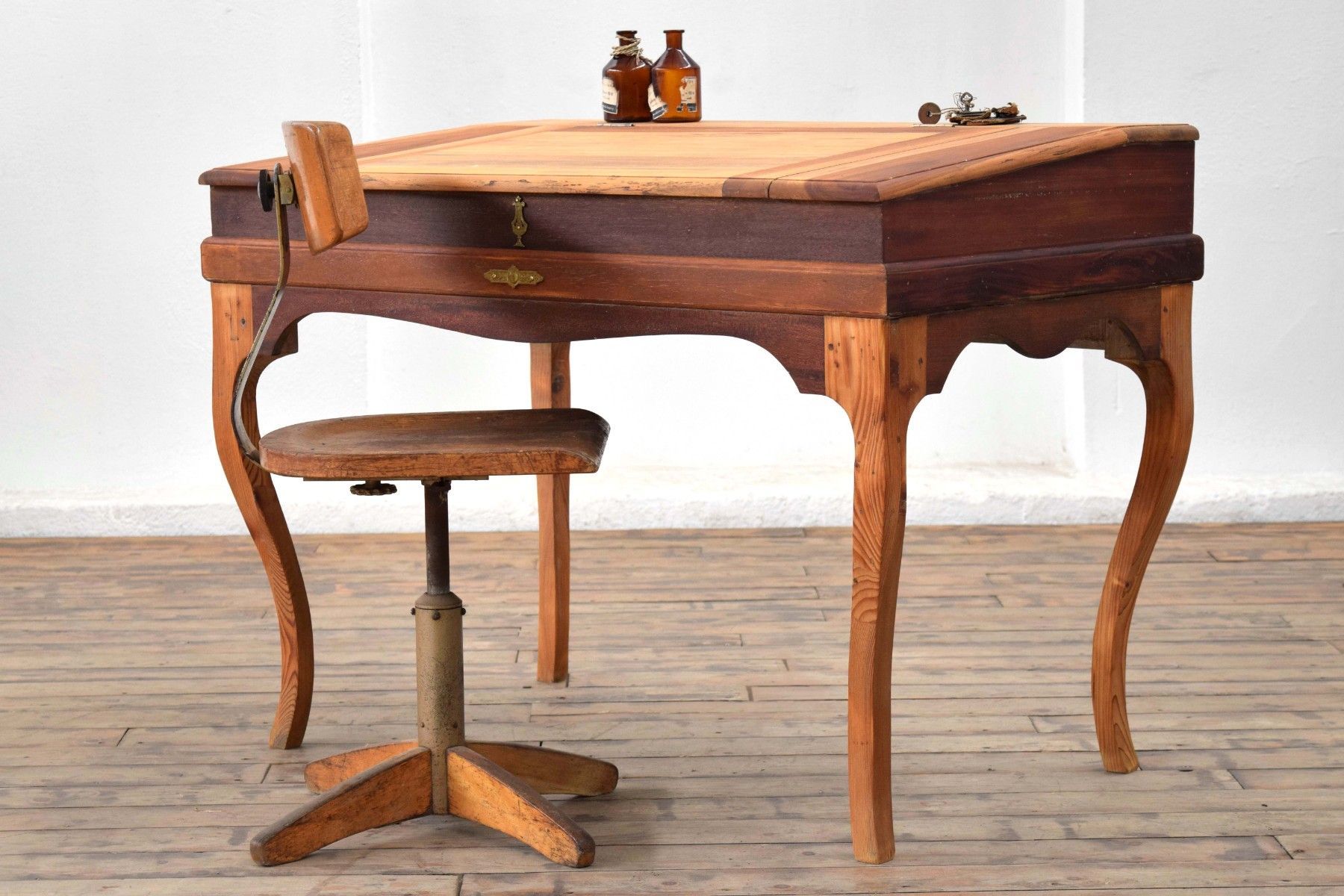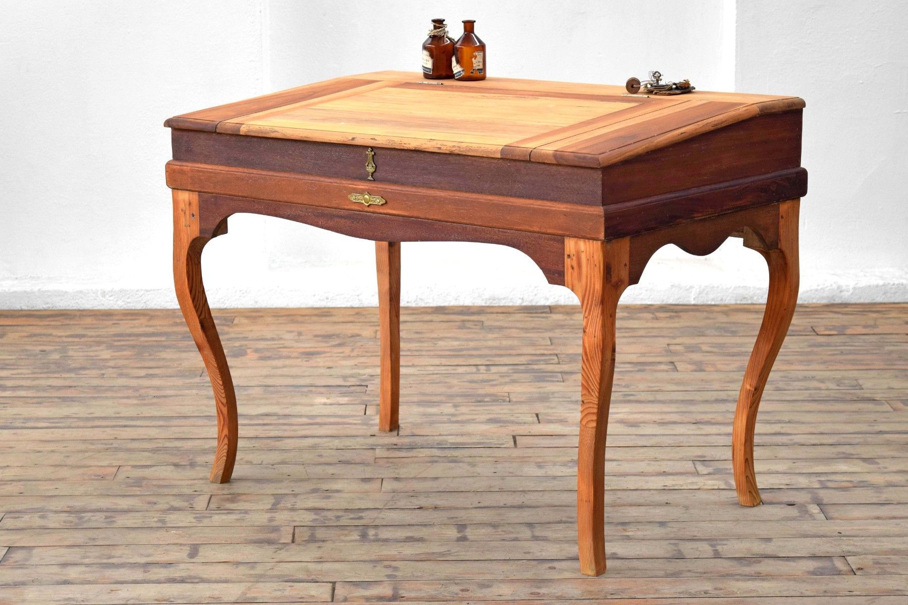 antiker Schreibtisch (um 1910) aus Vollholz (Fichte und Teak), Beschläge aus Messing Höhe 80 bis 85cm (Unterkante für Beinfreiheit 60cm), Breite 122cm, Tiefe 70cm angeschrägte Tischplatte mit großem aufklappbarem Fach, darin mehrere Unterteilungen mit Gebrauchsspuren, restauriert, stabil, sauber, wohnfertig, gepflegt freistehend verwendbar