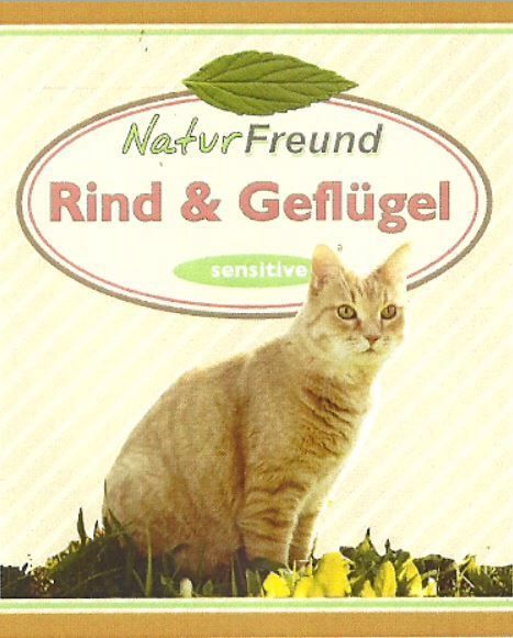 NaturFreund Rind & Geflügel Sensitive Fettarmes Fleisch vom Rind und Geflügel ist eine schmackhafte Nahrung für die Katze, mit besonders hochwertigen Proteinen. Diese Vollnahrung ist besonders gut verträglich. NaturFreund wird ohne Soja, Knochenmehl, Lock-,Farb- und Aromastoffe hergestellt. Herg