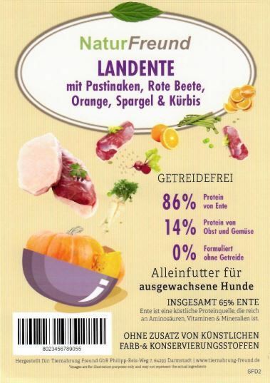 Beschreibung Mit einem extrem hohen Anteil von frischem Fleisch In unserem getreidefreien Trockenfutter mit Ente steckt besonders viel von der frischen, englischen Landente. Dadurch verfgt unser Futter, über einen besonders hohen Fleischanteil von insgesamt 65 %. Die Enten leben in England auf dem L