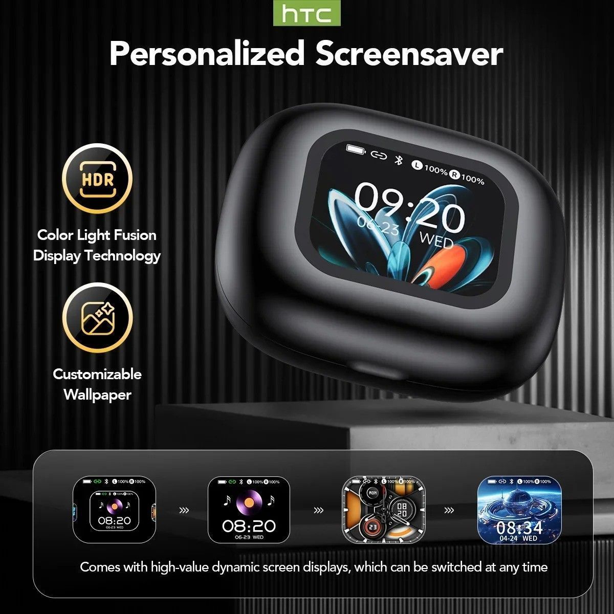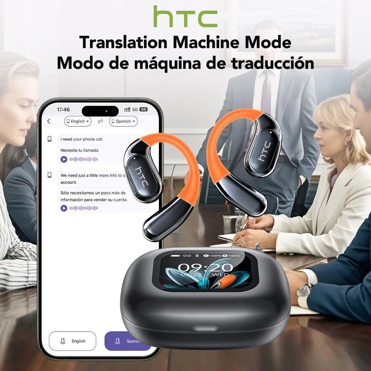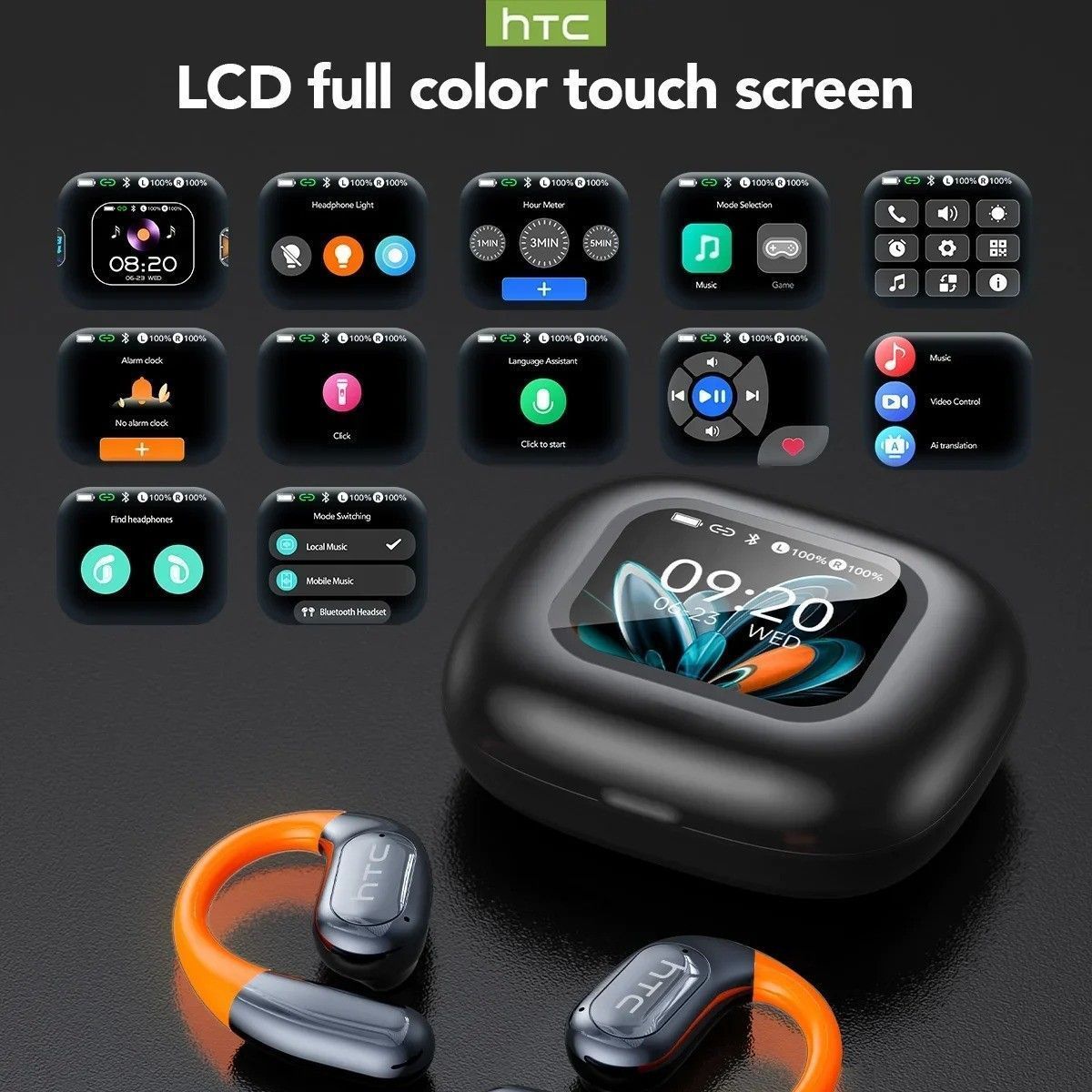 The HTC NE27 are Open-Ear Style (OWS) Bluetooth 5.4 earbuds featuring a touch screen interface and integrated AI translation functionality via the dedicated Earjoy app. They deliver immersive sound with deep bass and crystal-clear highs, utilizing adaptive EQ for personalized audio optimization. Eng