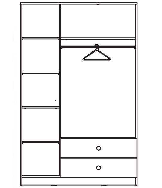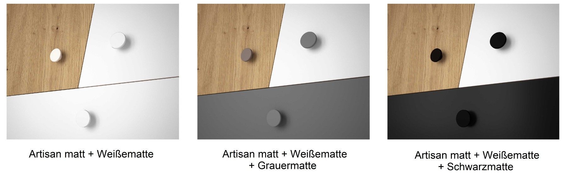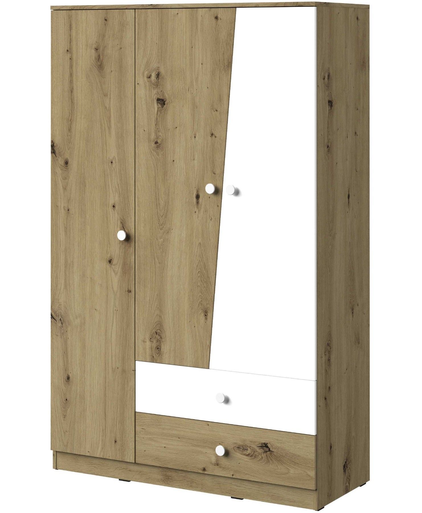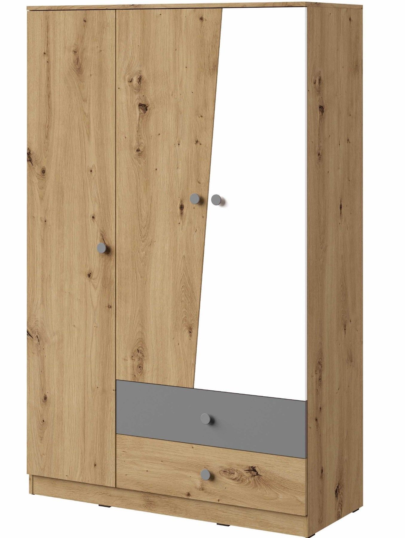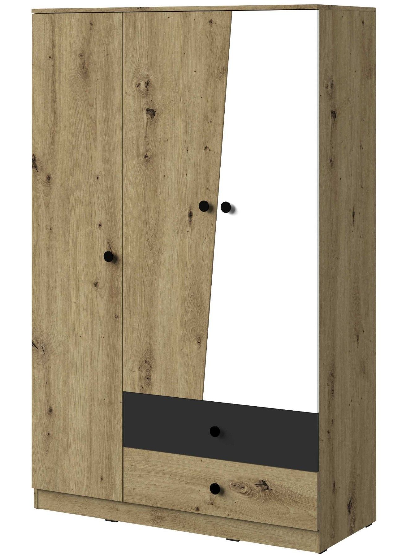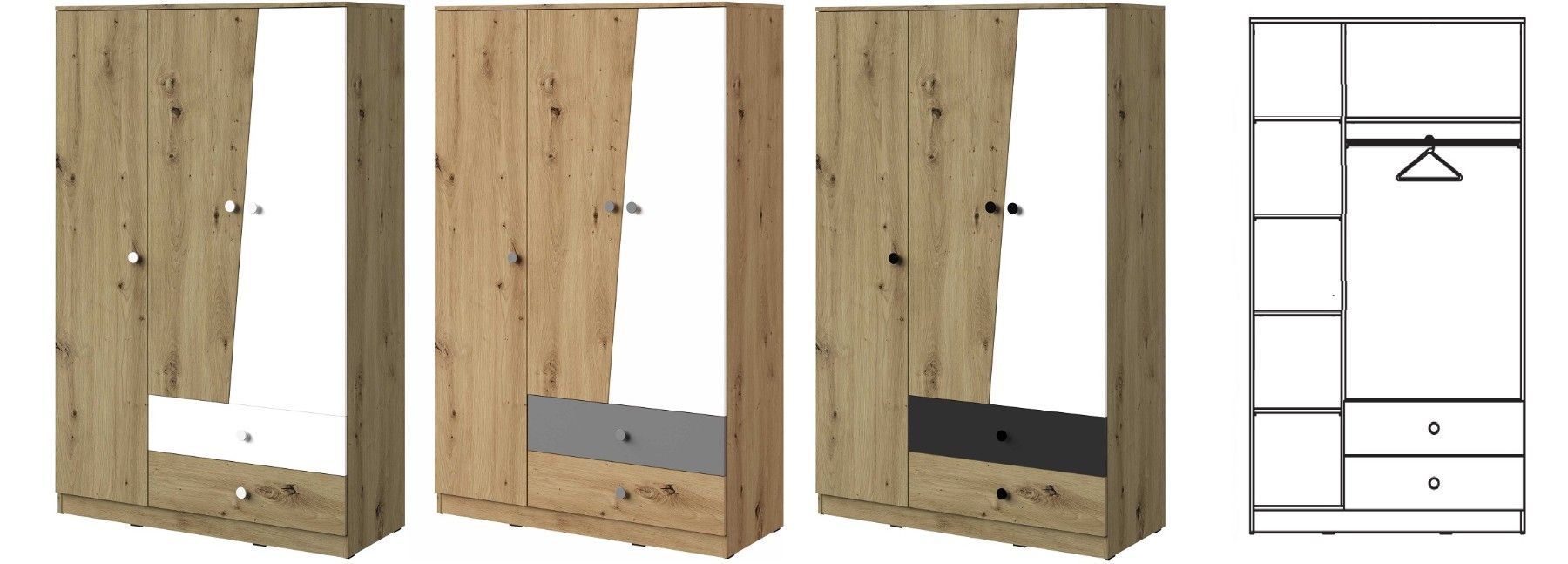 Nero NR3 - Dreitüriger Kleiderschrank mit Schubladen , großer Kleiderschrank für Jugendliche mit Einlegeböden und einer Stange Farbe: Eiche Artisan + weiße Matte Eiche Artisan + weiße Matte + graue Matte Eiche Artisan + weiße Matte + schwarze Matte Maße: Breite: 120 cm Höhe: 190 cm Tiefe: 50 cm Ausf