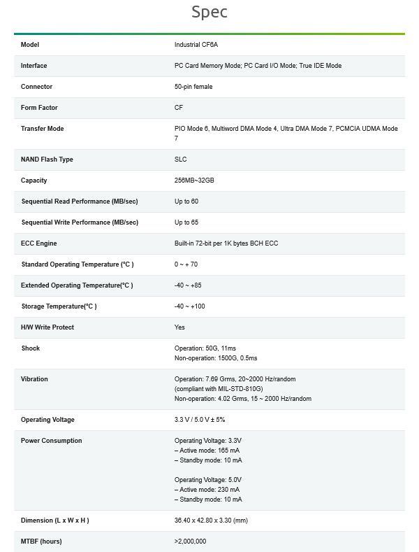 2GB Apacer Industrial CF6A CompactFlash (CF) SLC Schlagen Sie einen Preis vor! _ Beschreibung _ Kompatibilität mit Ihrem Gerät vor dem Kauf überprüfen! - Speicherkapazität: 2GB - Leserate: bis zu 60 MB s - Schreibrate: bis zu 65 MB s - Betriebstemperatur: -40 bis 85°C - Temperaturbereich bei Lag