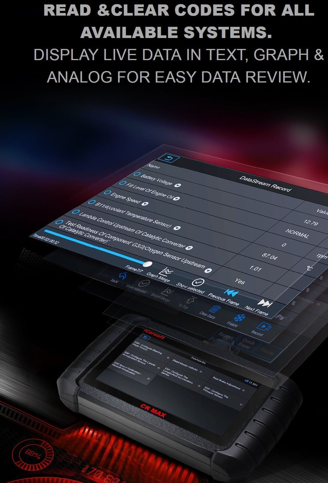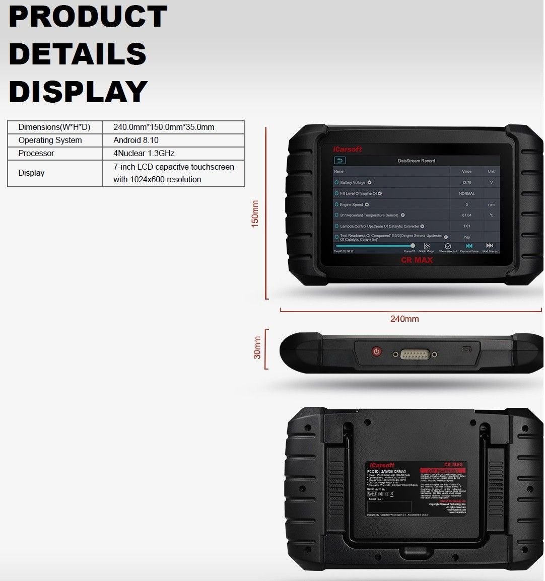 ICARSOFT CR MAX IST EIN PROFESSIONELLES UND LEISTUNGSSTARKES FAHRZEUG-FEHLERDIAGNOSE-TOOL FÜR MEHRMARKEN-FAHRZEUGE (MEHR ALS 40 FAHRZEUGARTEN), ENTWICKELT VON ICARSOFT TECHNOLOGY INC. MIT EINEM 7,0"-LCD-KAPAZITIVEN TOUCHSCREEN UND EINEM 10 DIE FÄHIGKEIT, DTCS FÜR ALLE VERFÜGBAREN MODULE DER MEHRHEITSMARKEN UND MODELLE AUF DEM MARKT SCHNELL ZU LESEN UND ZU LÖSCHEN, CR MAX BIETET IHNEN ÜBERLEGENE SPEZIELLE FUNKTIONEN. ISO9141, KWP2000 UND J1850 ETC.