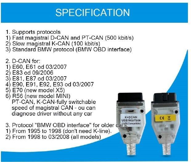 OBD Diagnosekabel für BMW für BMW E60,E61, E83,E81,E90 - Funktionen 1. Fehler lesen und löschen 2. Anpassungen 3. Treiberprogrammierung 4. Applu-Codierung 5. und andere - Spezifikationen 1. Support-Protokolle 1.1.FAST magistral D-CAN und PT-CAN (500 kbit s) 1.2.SLOW magistral K-CAN (100 kbit s) 1.3.