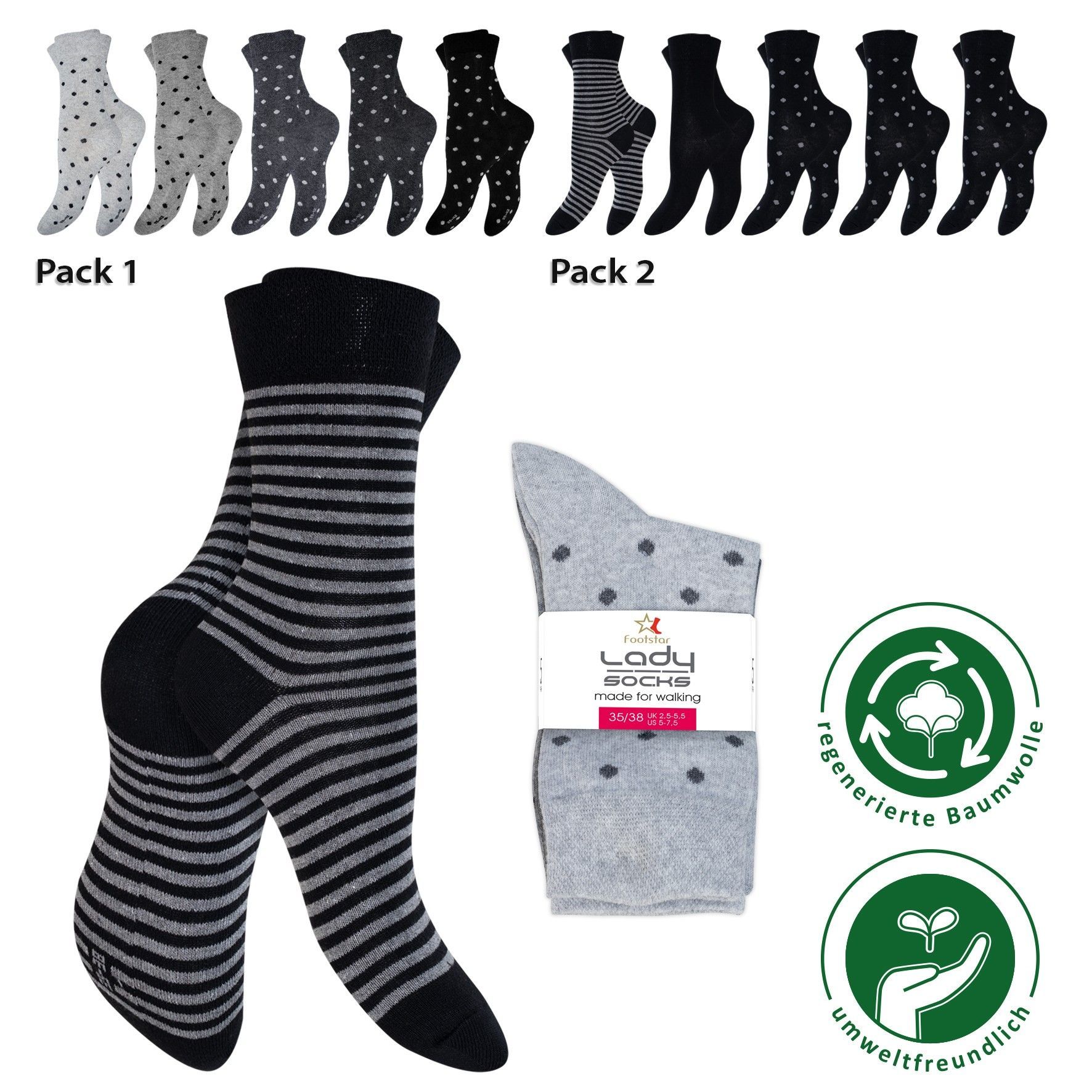 Verleihen Sie Ihren Füßen Komfort und Stil mit den hochwertigen Wadensocken von Footstar, ideal für Damen, die Wert auf Qualität und Komfort legen. Diese Socken sind in den Größen 35 - 38 und 39 - 42 erhältlich und bestehen aus einer weichen Mischung aus 70% Baumwolle, 25% Polyester und 5% Elasthan,
