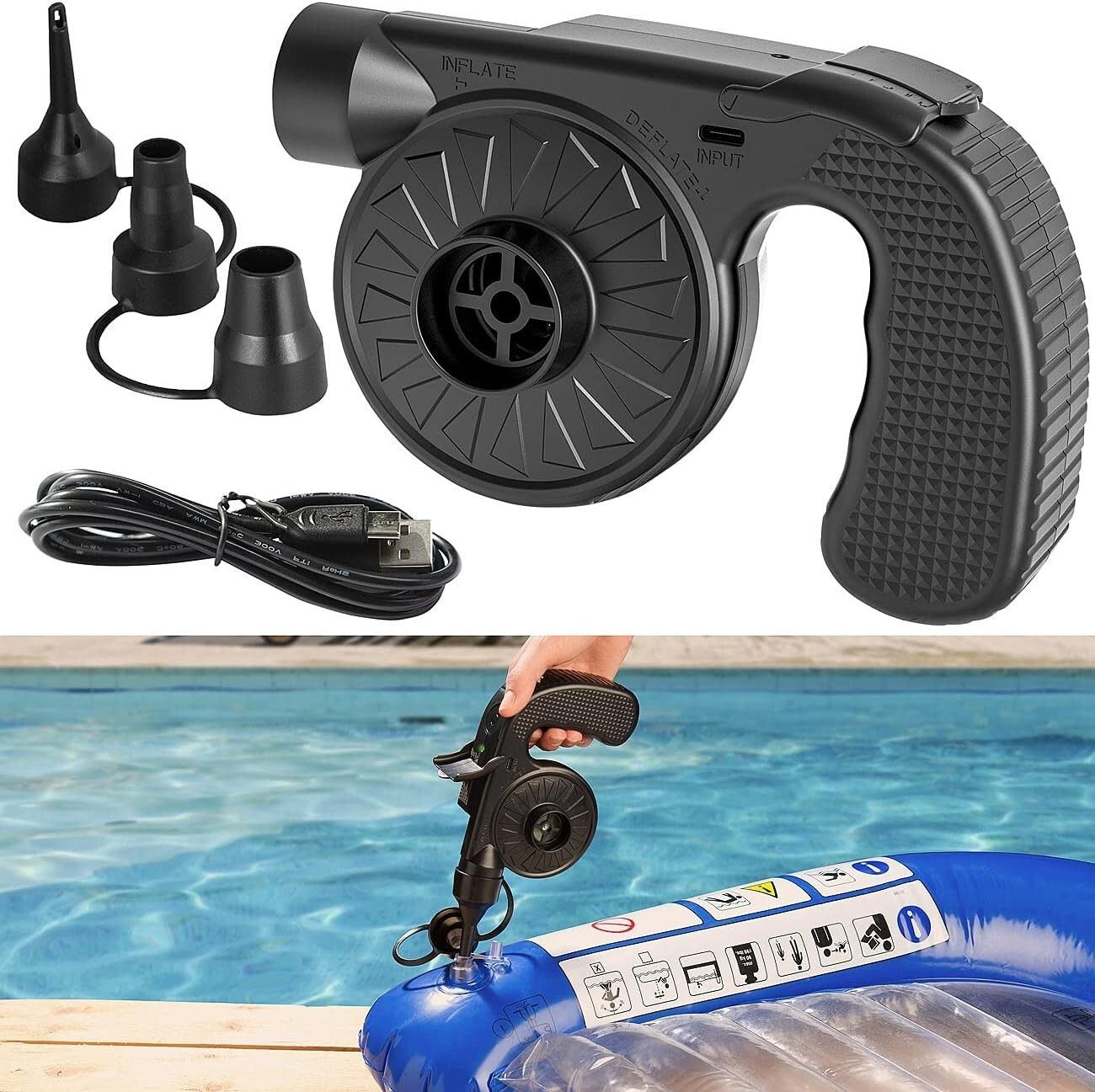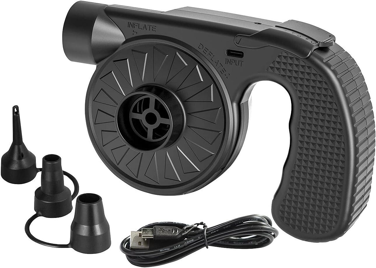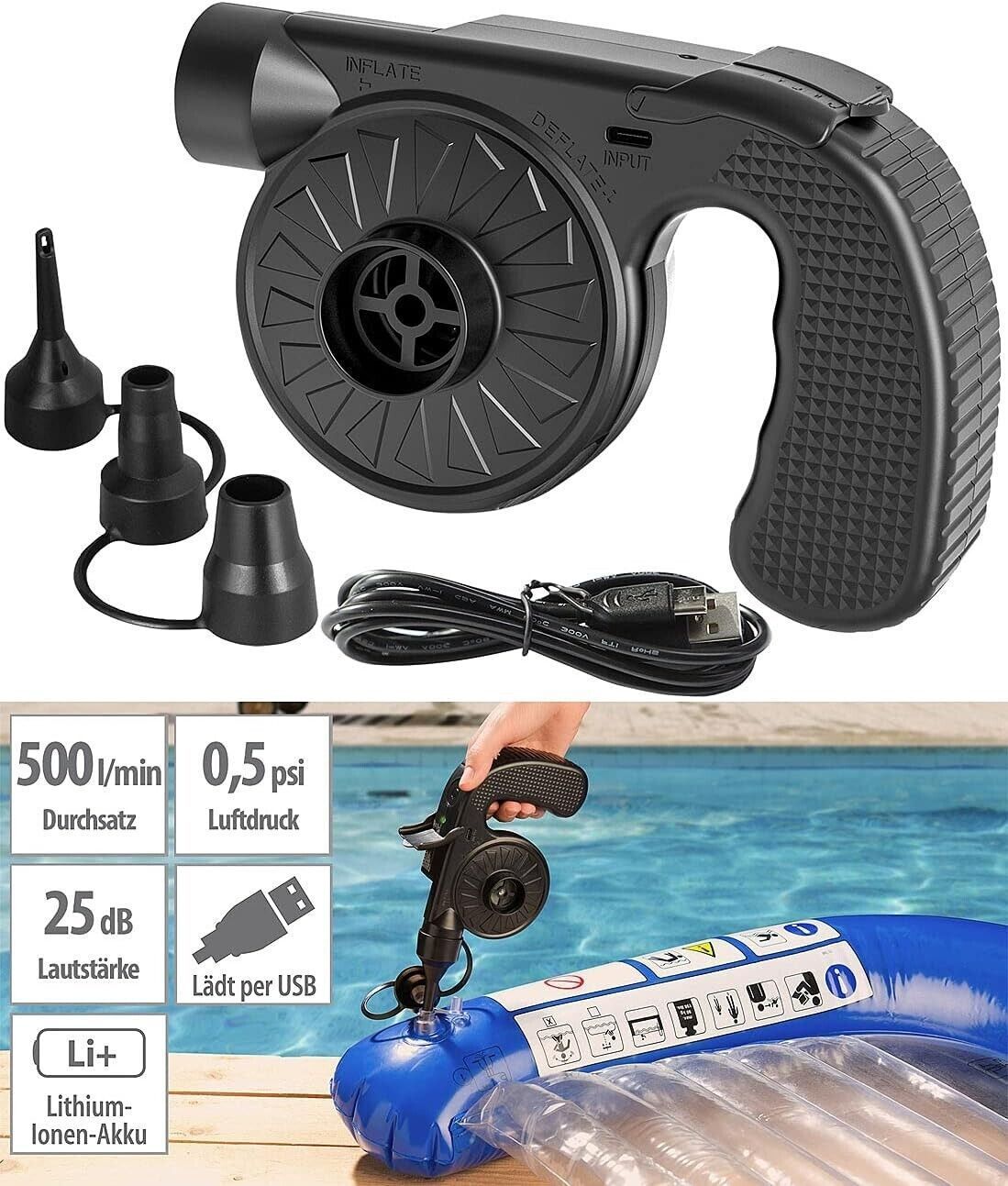 infactory NEU Akkuluftpumpe + 3 Ventil Aufsätzen USB 500L/Min für Sport Freizeit Camping