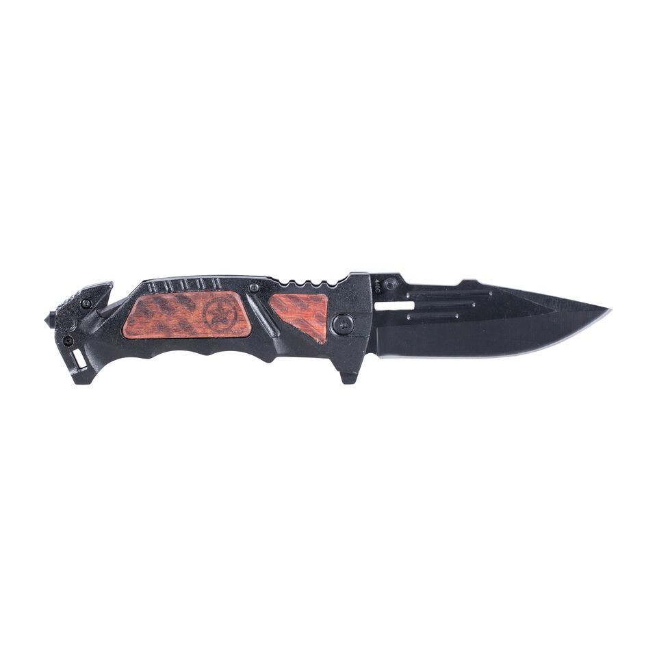 inklusive Etui und Holzeinlagen - Klingenstärke: 3 mm - Klingenfarbe: Schwarz - Öffnung: Manuell - Öffnungshilfe: Daumenpin - Verschluss: Linerlock Material: - Klinge: 100% 440C - Griff: 100% Aluminium - Etui: 100% Nylon Maße: - Gesamtlänge: 22 cm - Klingenlänge: 8,5 cm