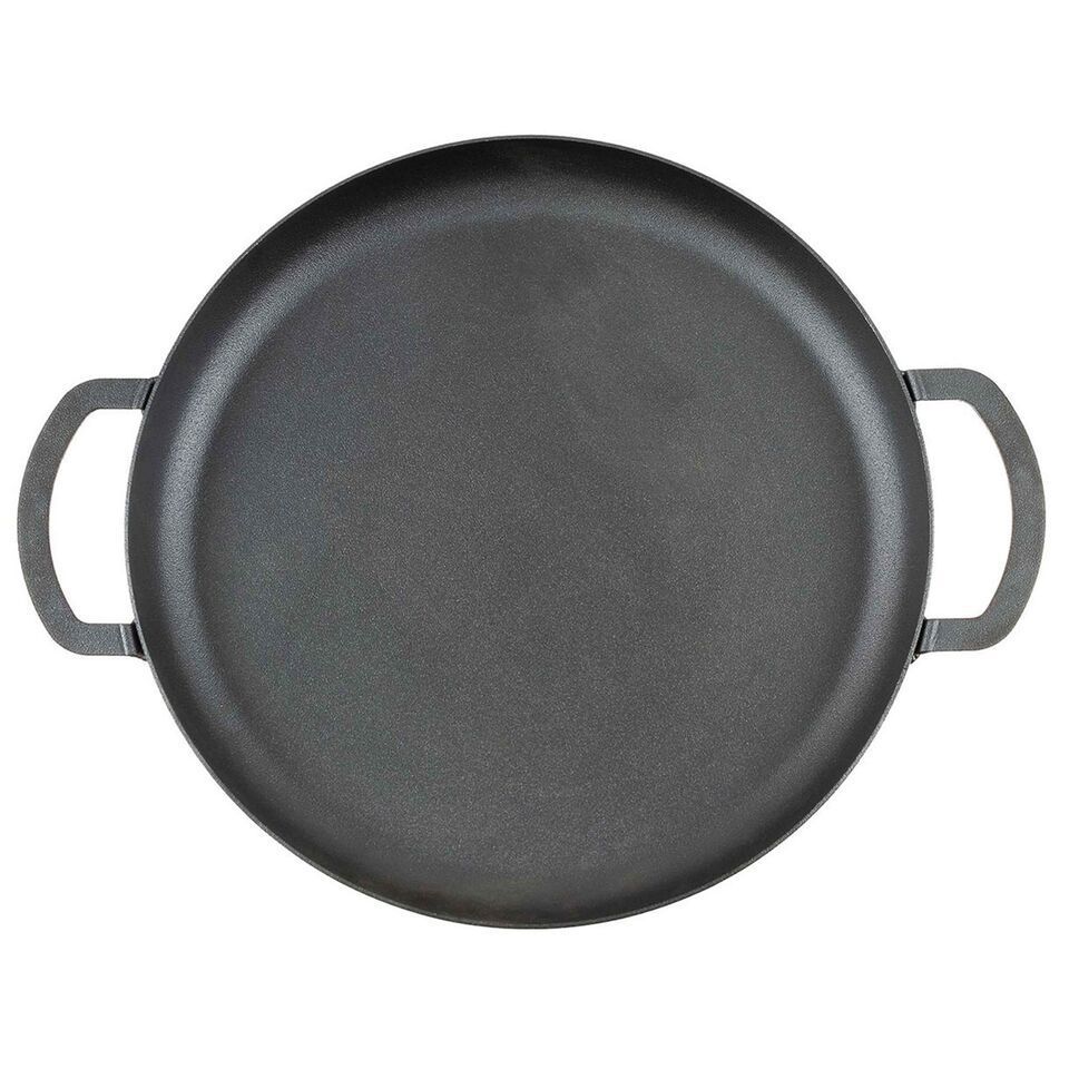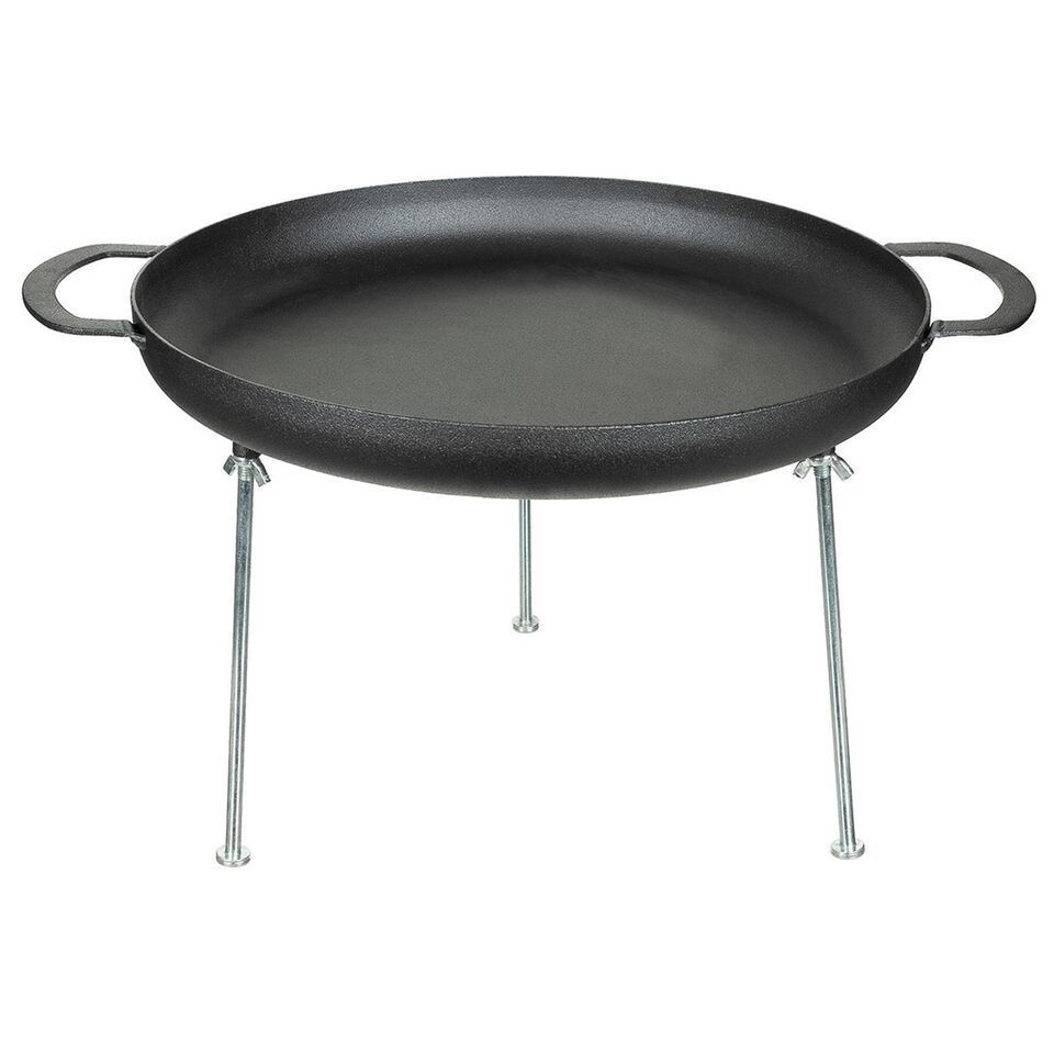 Euro Camp & Food präsentiert: Die Schale ist mit zwei Griffen ausgestattet und dank der Größe können Sie problemlos Mahlzeiten für eine größere Menge an Gästen zubereiten. Material: - Schale: 100% Eisen - Standfüße: Eisen verzinkt Maße: - ohne Standfüße: ca. 55,5 x 7 cm - mit Standfüße: ca. 55,5 x 31 cm - Durchmesser innen: ca. 44 cm