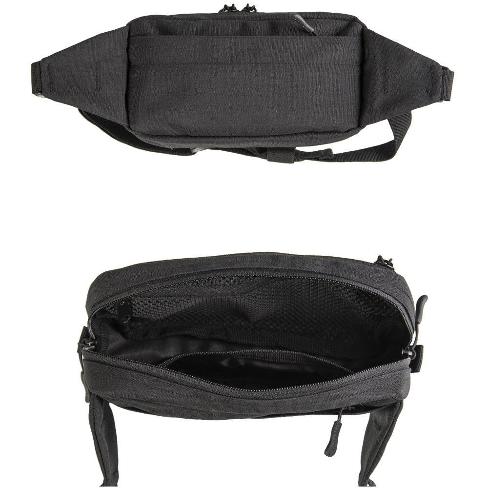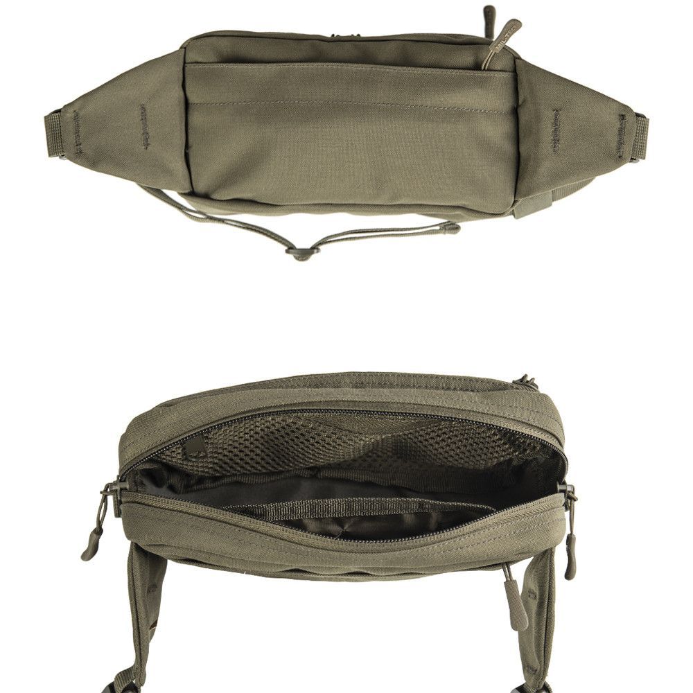 Kompakte Gürteltasche mit Klett-MOLLE Schlaufen auf der Vorderseite. Sie verfügt über 2 Hauptfächer, von denen eines mit einem Netzfach und breiten Elastikschlaufen ausgestattet ist.
