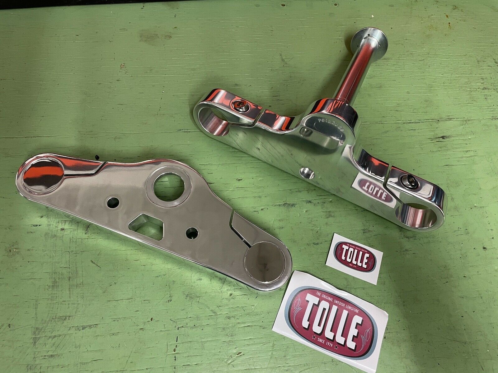 NEUE Tolle-Gabel +3 Grad Fat Bob Custom Style Gabelbrückensatz mit sichtbaren Verschlusstopfen der Standrohre für die meisten Starrahmen, Duo-Glides, 4-Gang FL FX und Softail Modelle bis 1990, wenn separate Lenkkopflageraufnahmen verwendet werden. Verkaufspreis original Zodiac (731172): 965,00 € Der