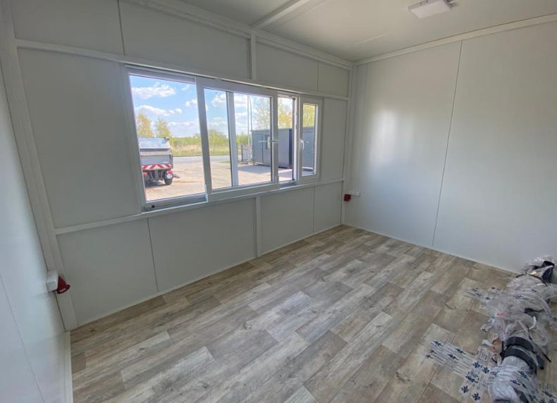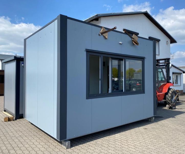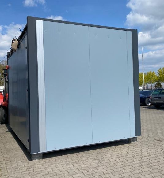 Imbisscontainer 3,00 x 4,00 m - großes Schiebefenster für Außer-Haus-Verkauf Serienmäßige Ausstattung: - Offene Rahmenbauweise mit Aufputz Installation - kultiges Industrie Design - Silber Anthrazit - Dämmung Wand und Fußboden 100 mm PU-Wärmedämmschaum, Dach 120 mm - 1 Nebeneingangstür 800 x 2100 mm