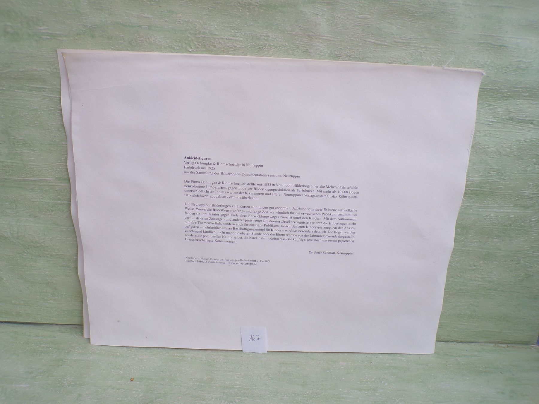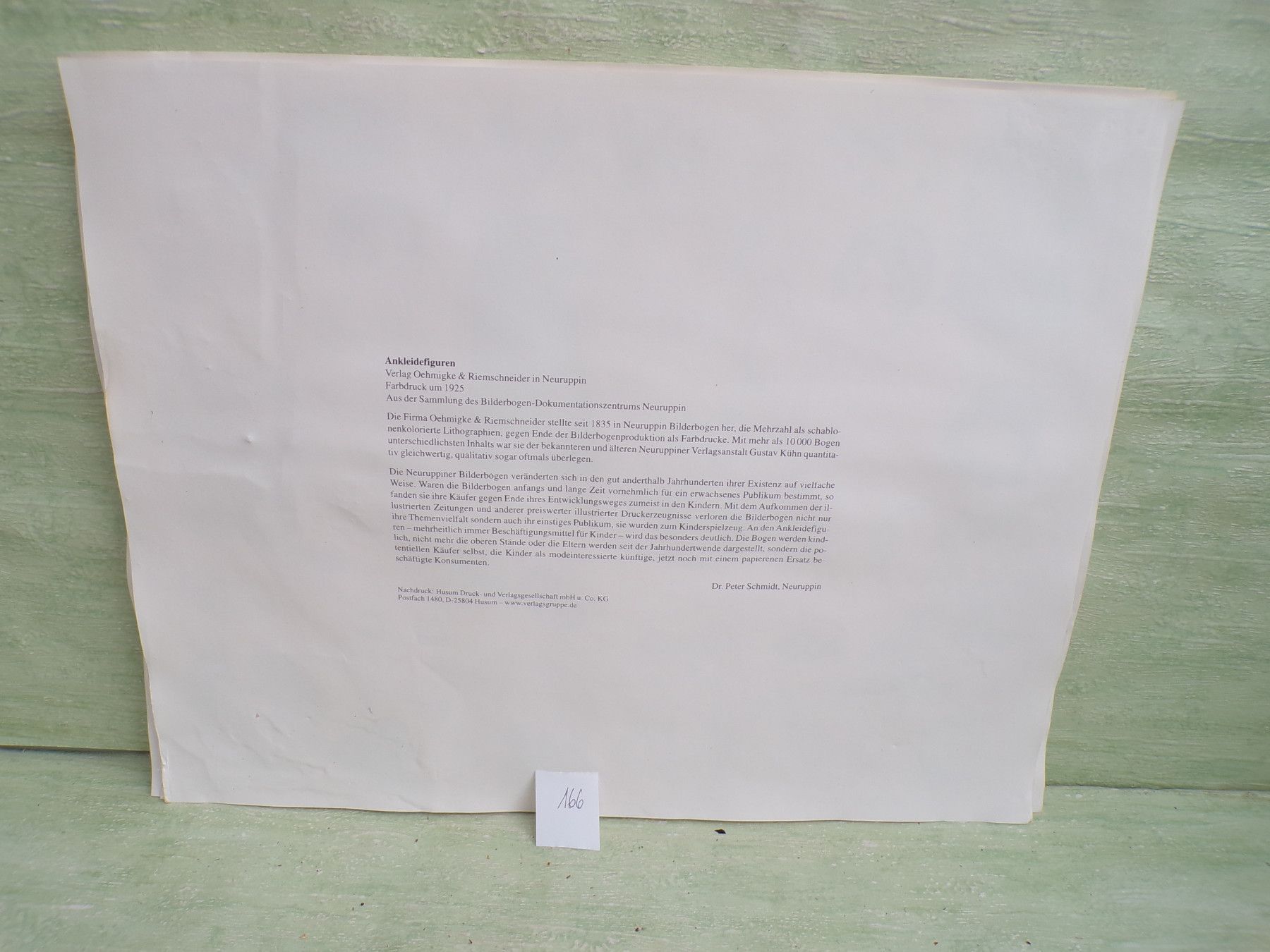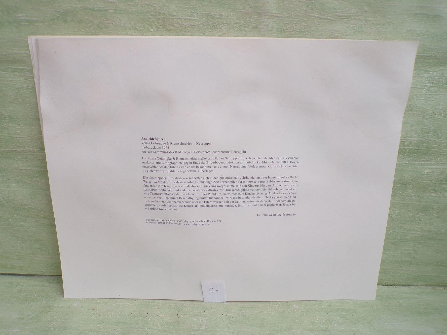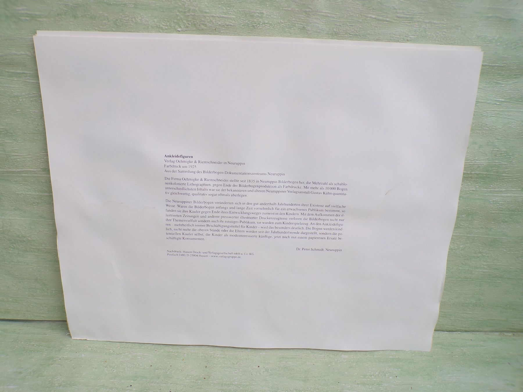 * * * Sammeln & Seltenes - Reklame & Werbung * * * * ... aus Freude an schönen Dingen ..... ca 43 x 33,5 cm Oehmigke & Riemschneider - Farbdruck um 1925 Reprint der Fa Dr Peter Schmidt , Neuruppin Ankleidefiguren . Die Bogen sind aufgrund eines Wasserschadens wellig & haben teilweise... Mehr