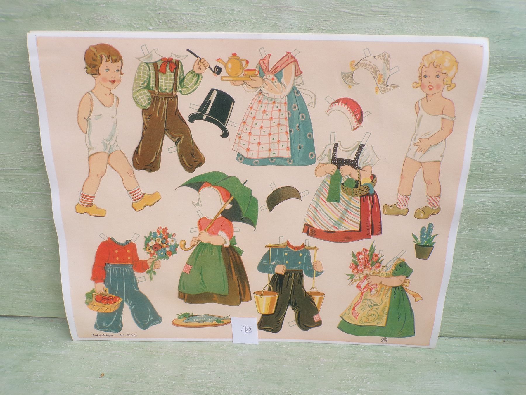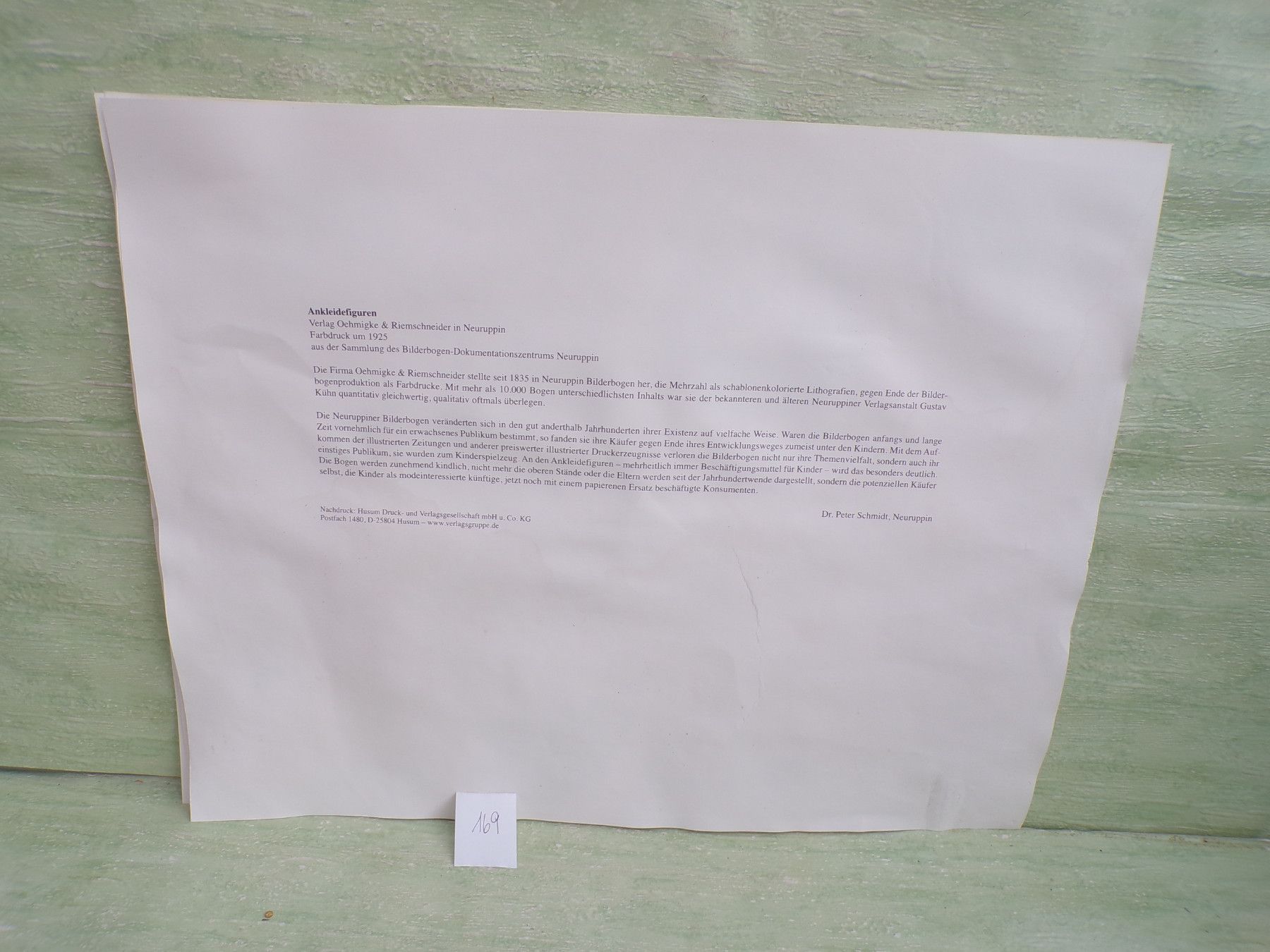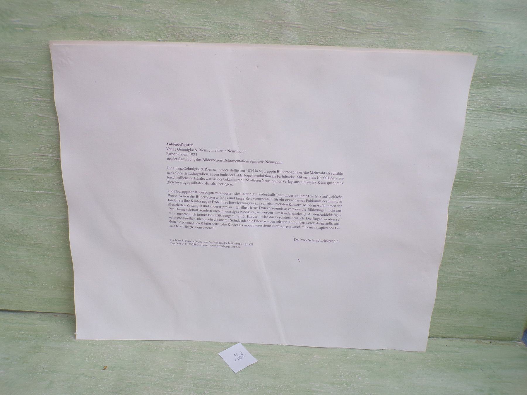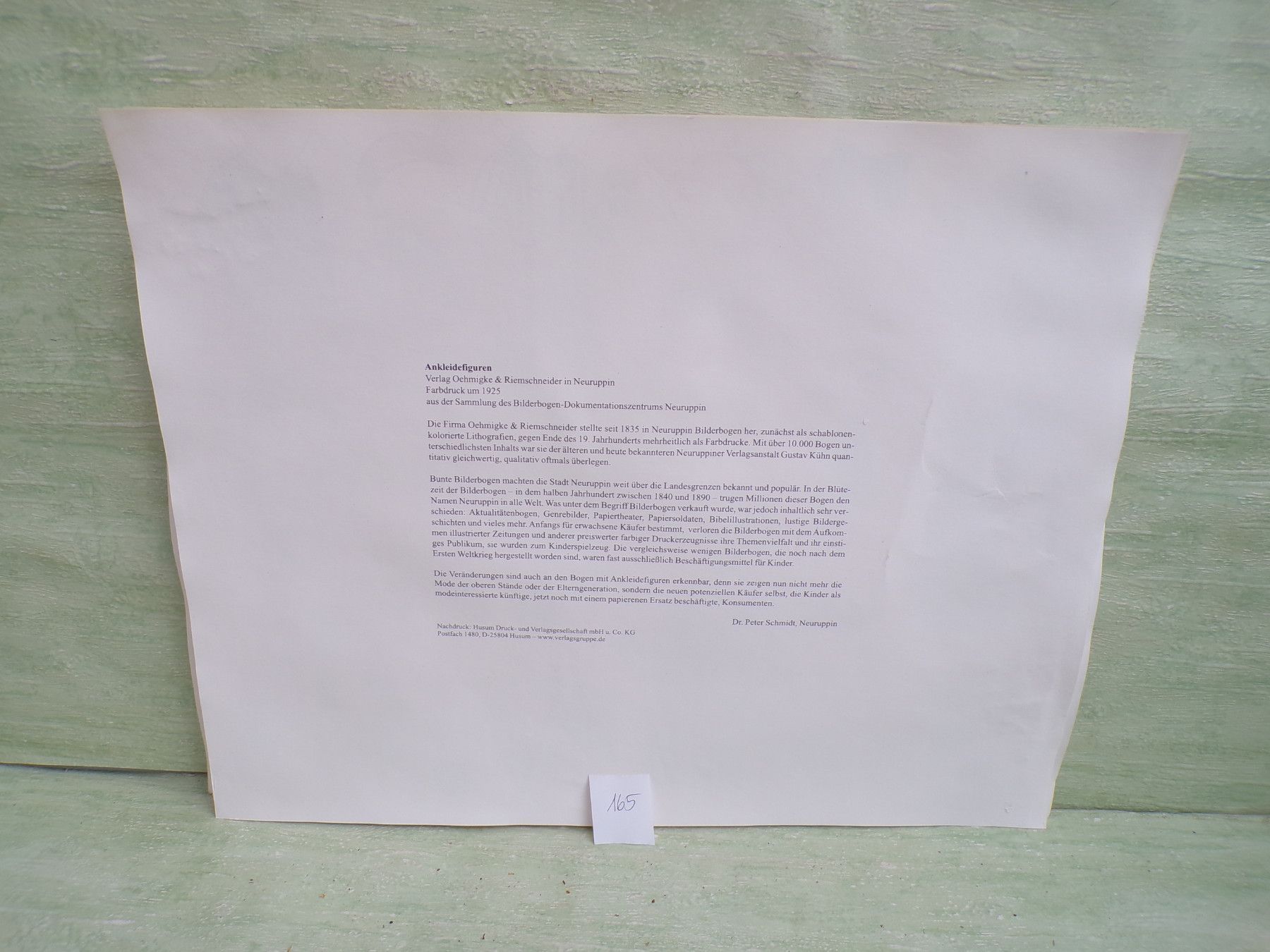 * * * Sammeln & Seltenes - Reklame & Werbung * * * * ... aus Freude an schönen Dingen ..... ca 43 x 33,5 cm Oehmigke & Riemschneider - Farbdruck um 1925 Reprint der Fa Dr Peter Schmidt , Neuruppin Ankleidefiguren . Die Bogen sind aufgrund eines Wasserschadens wellig & haben teilweise... Mehr