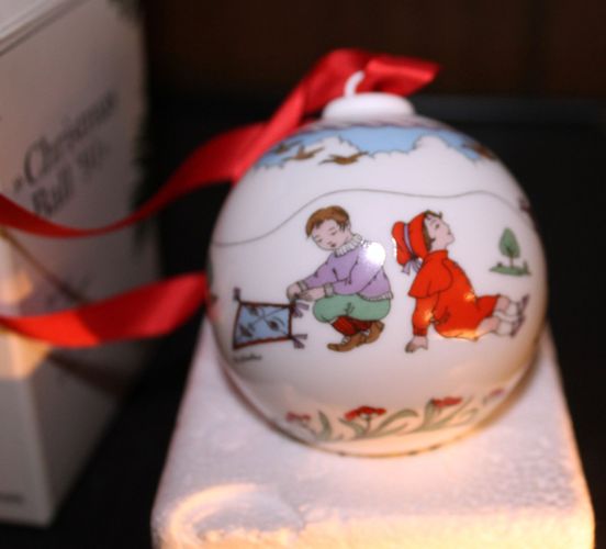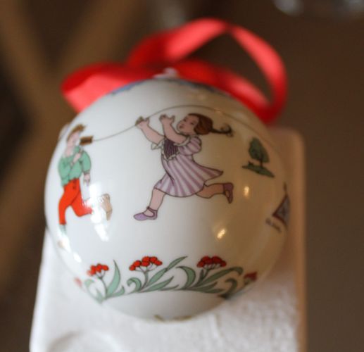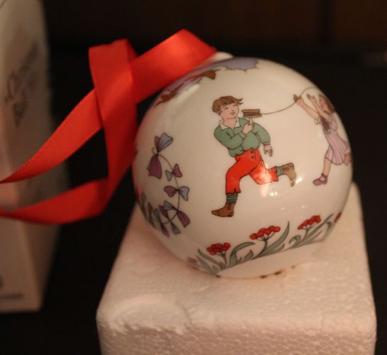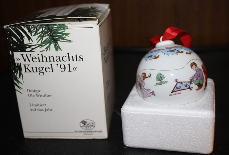 mit rotem Stoffband in Originalverpackung, ca. 6 cm Durchmesser, bunt bemalt, allgemein als Weihnachtskugel bezeichnet, mit einem jährlich wechselnden Motiv von „Ole Winther“ zu einer bekannten Serie des Herstellers HUTSCHENREUTHER, hier für 1991 mit Kindern beim Drachensteigen als Rundum-Motiv, die