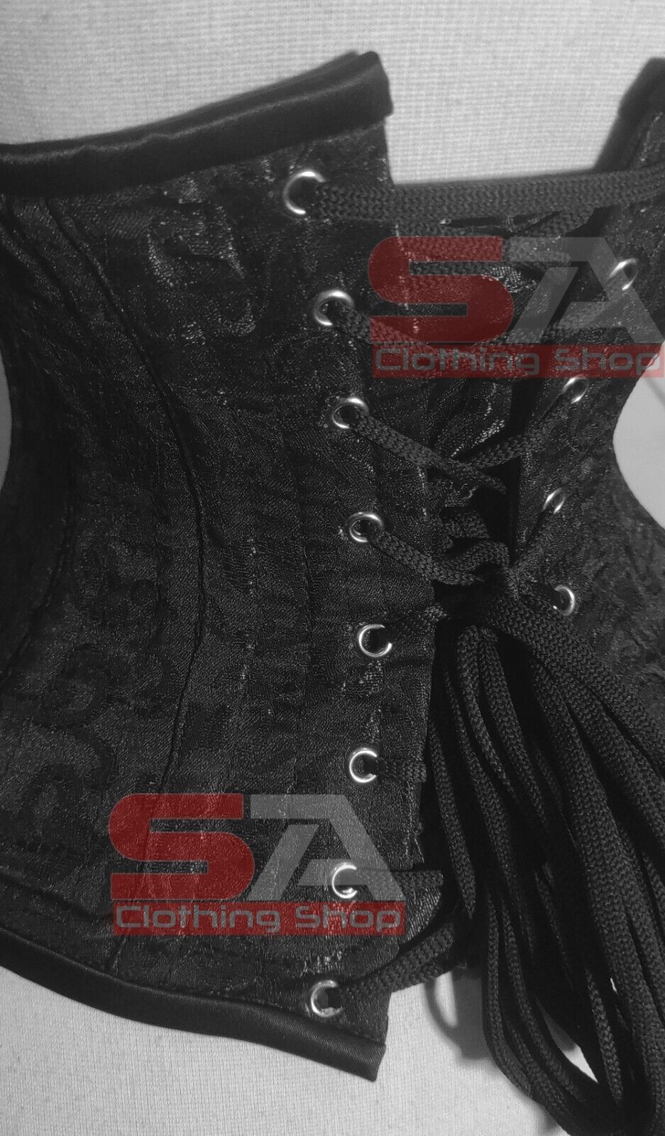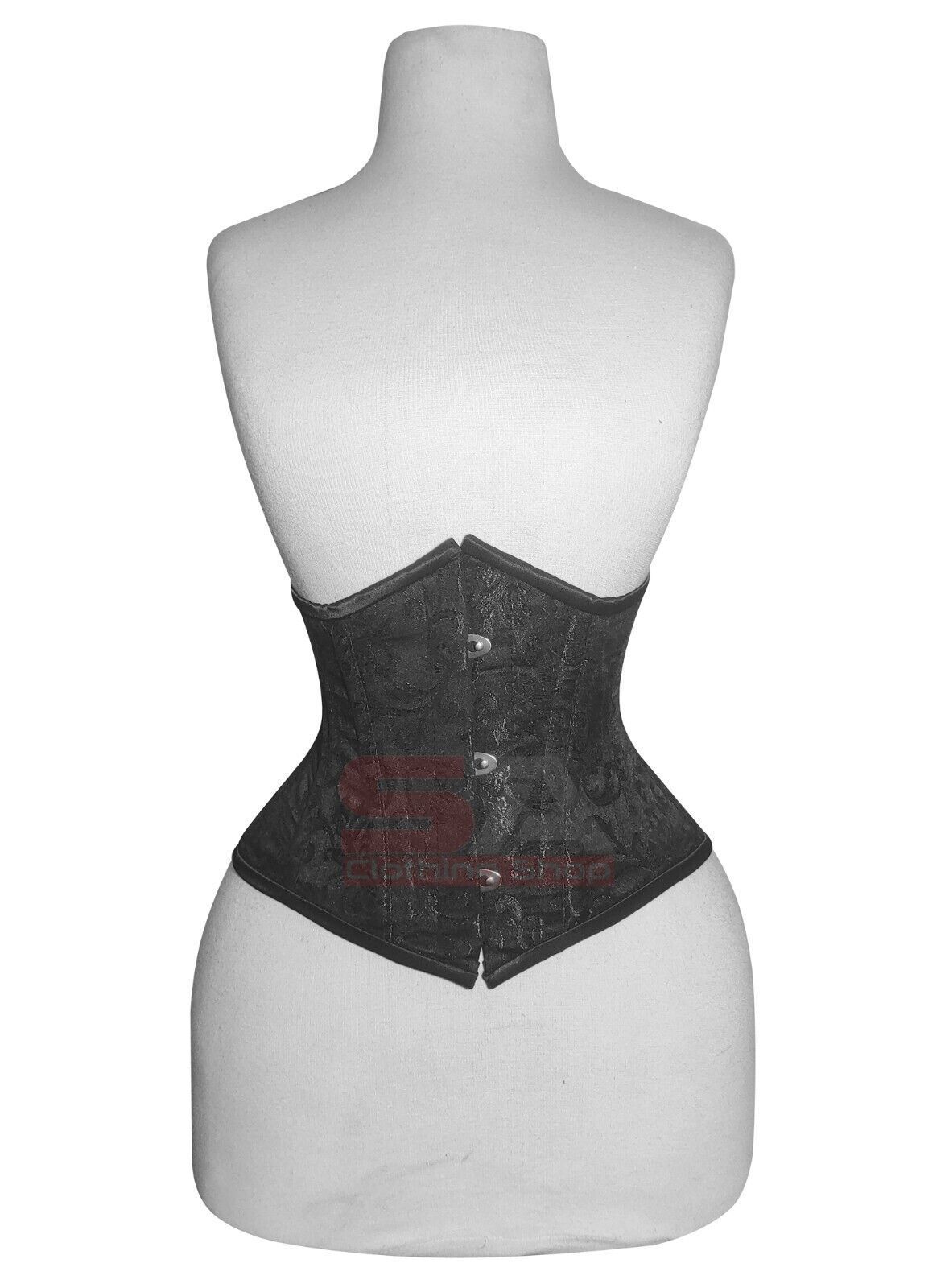 Description Corset Detail Outer Shell: 100% Polyester Brocade Inner Shell: 100% Cotton Twill Underwired: 100% steel bones Closure: Rust free metal claps Corset Front Length: 10.5 Corset Side Length: 9.5 Corset Back Length: 10 5 Modesty Panel at the back Corset features Heavy Duty, Very Strong Fully