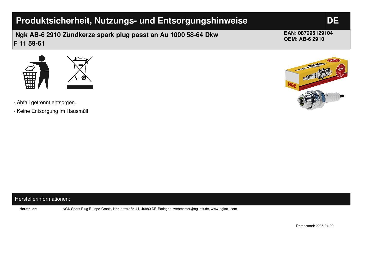 NGK Ngk AB-6 2910 Zündkerze spark plug passt an Au 1000 58-64 Dkw F 11 59-61