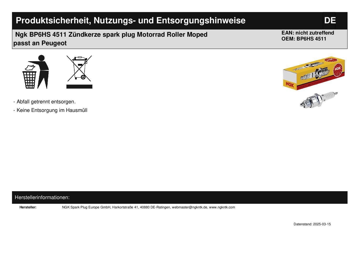 Ngk BP6HS 4511 Zündkerze spark plug Motorrad Roller Moped passt an Peugeot