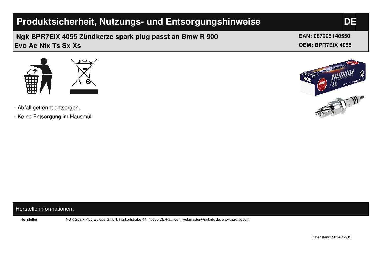 NGK Ngk BPR7EIX 4055 Zündkerze spark plug passt an Bmw R 900 Evo Ae Ntx Ts Sx Xs