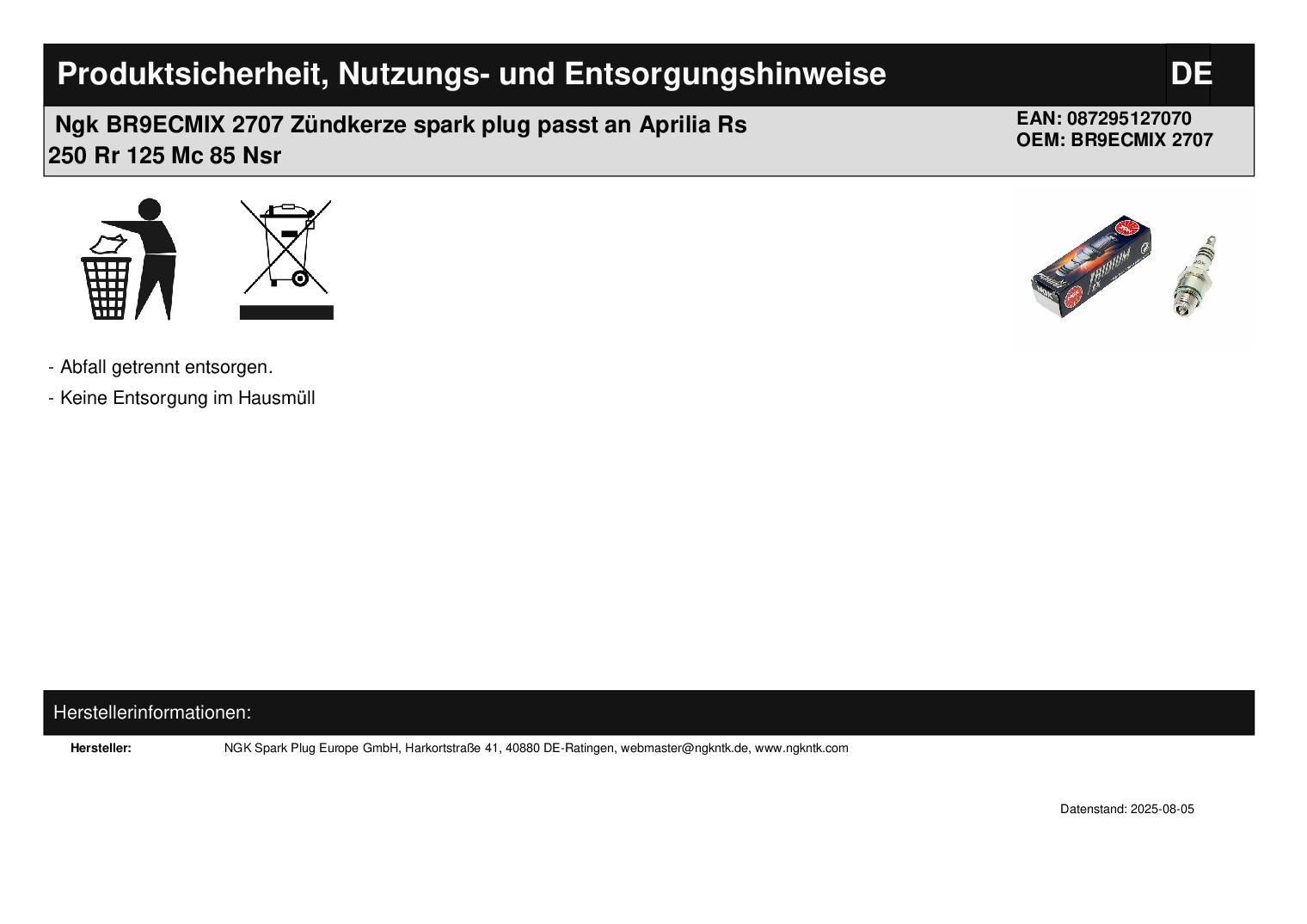 NGK Ngk BR9ECMIX 2707 Zündkerze spark plug passt an Aprilia Rs 250 Rr 125 Mc 85 Nsr