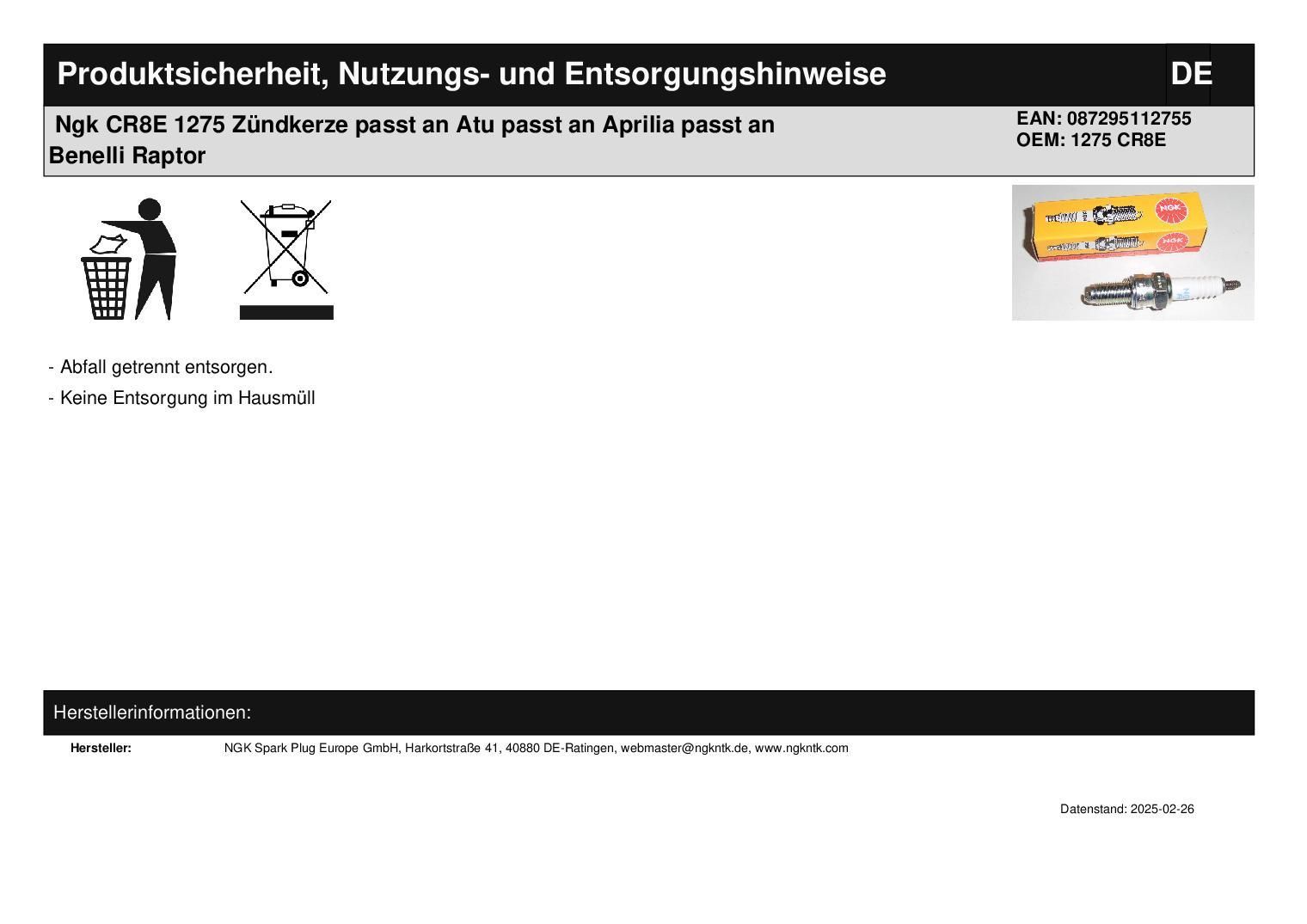 NGK Ngk CR8E 1275 Zündkerze passt an Atu passt an Aprilia passt an Benelli Raptor