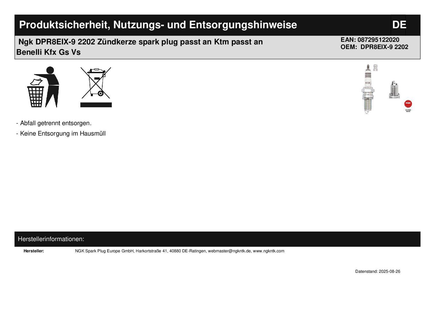 NGK Ngk DPR8EIX-9 2202 Zündkerze spark plug passt an Ktm passt an Benelli Kfx Gs Vs