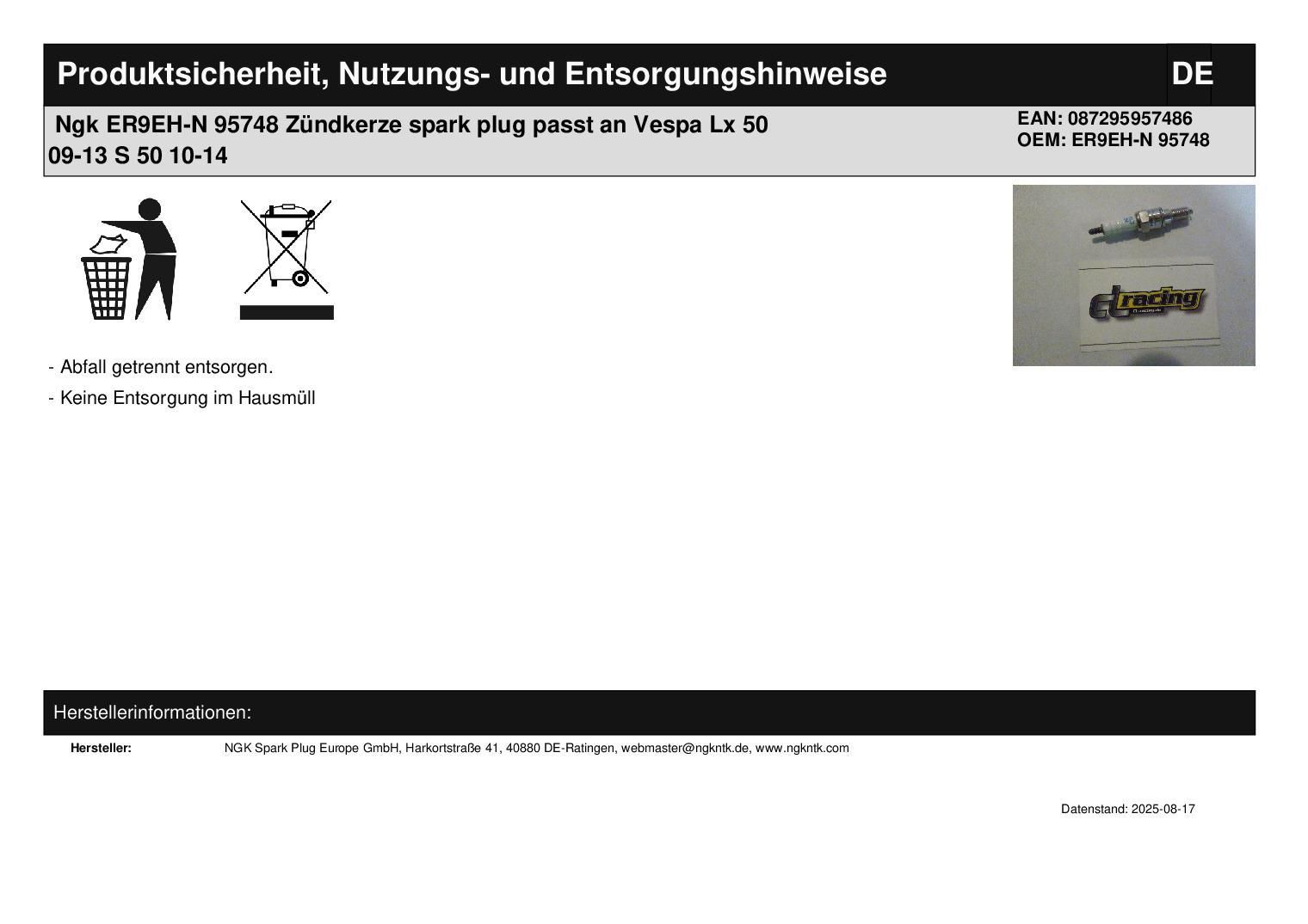 NGK Ngk ER9EH-N 95748 Z?ndkerze spark plug passt an Vespa Lx 50 09-13 S 50 10-14