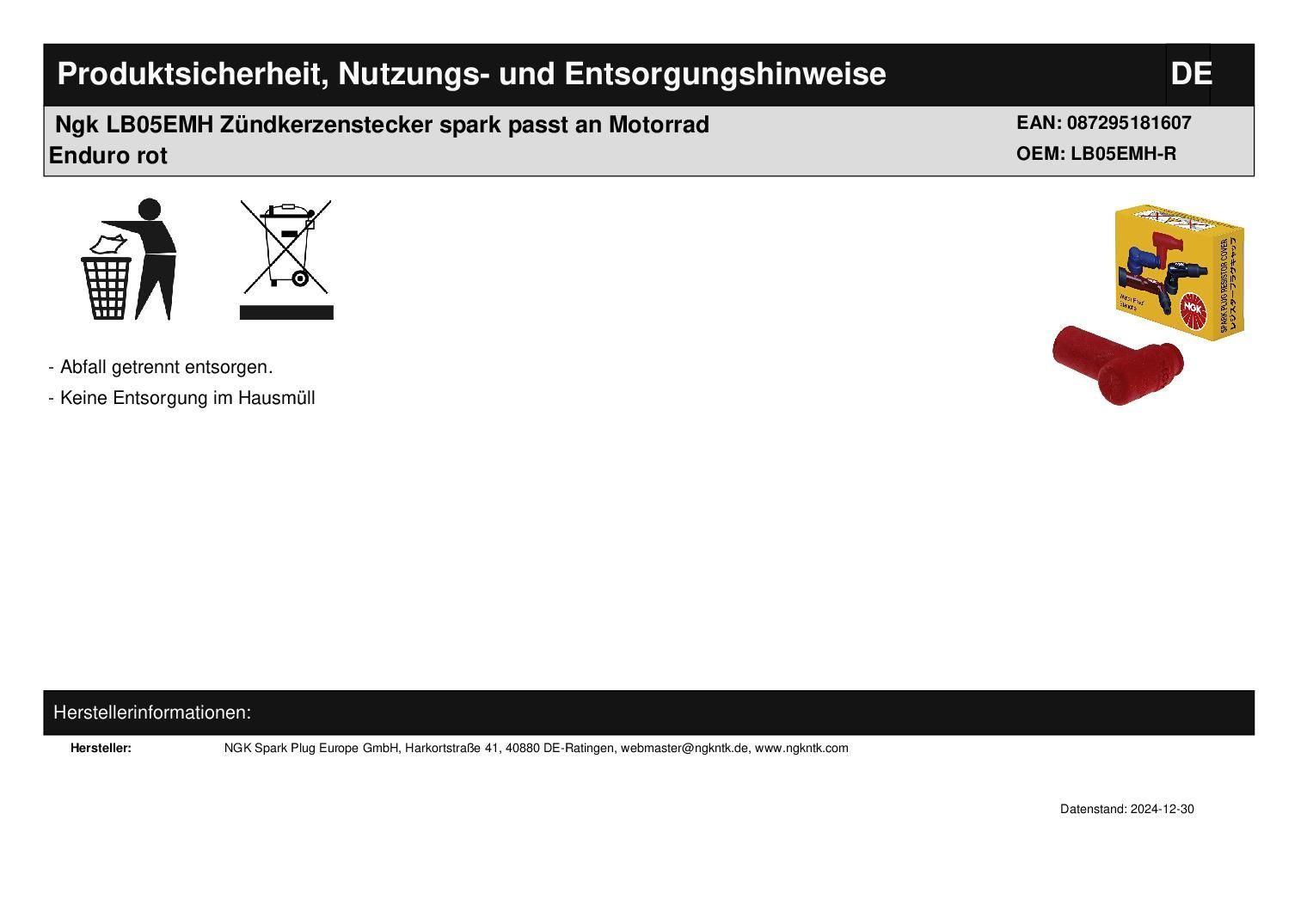 NGK Ngk LB05EMH Z?ndkerzenstecker spark passt an Motorrad Enduro rot