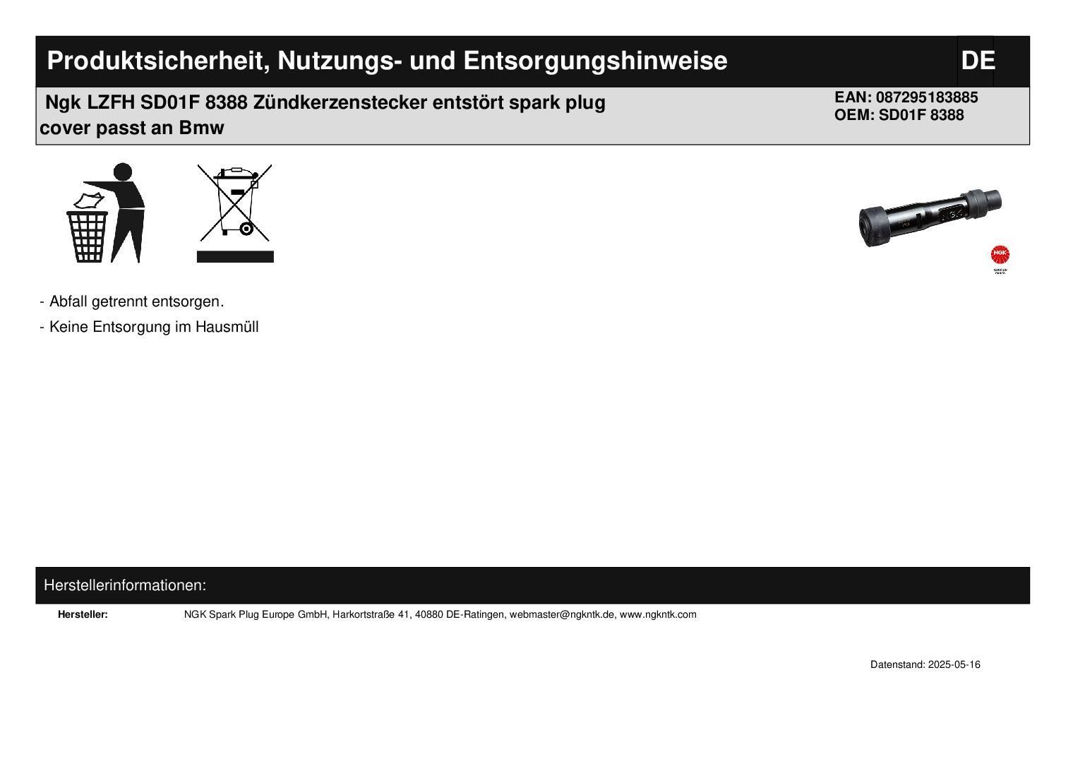 NGK Ngk LZFH SD01F 8388 Zündkerzenstecker entstört spark plug cover passt an Bmw