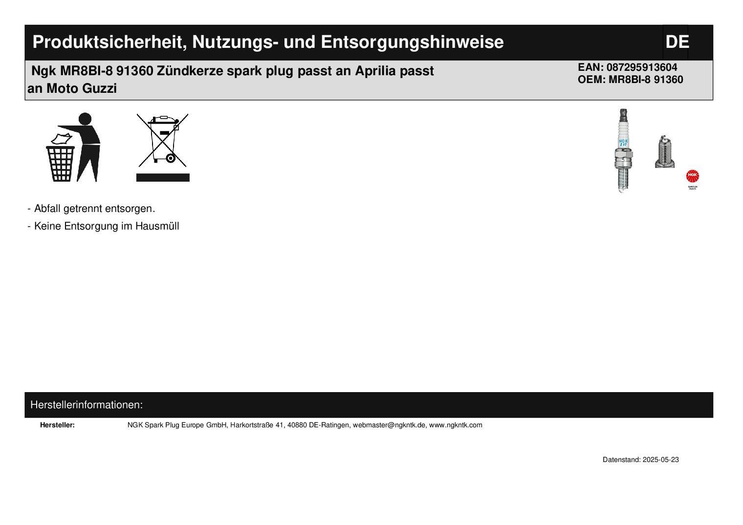 NGK Ngk MR8BI-8 91360 Zündkerze spark plug passt an Aprilia passt an Moto Guzzi