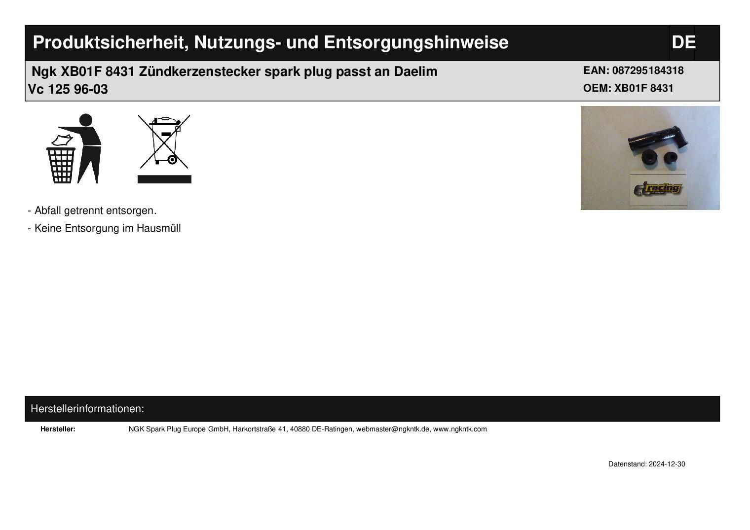 NGK Ngk XB01F 8431 Zündkerzenstecker spark plug passt an Daelim Vc 125 96-03