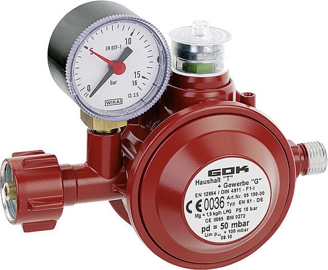 Niederdruckregler GOK Typ EN61-DS PS 16 bar 50 mbar 1,5 kg h KLF x G 1 4 LH-KN Baujahr 2025 1,5 kg h mit intergrierter Überdrucksicherheitseinrichtung S2SR (ÜDS) und thermischer Absperreinrichtung T (TAE). Vorschrift bei allen privat und gewerblich genutzten Heizgeräten im Gebäude (z.B. Katalytöfen